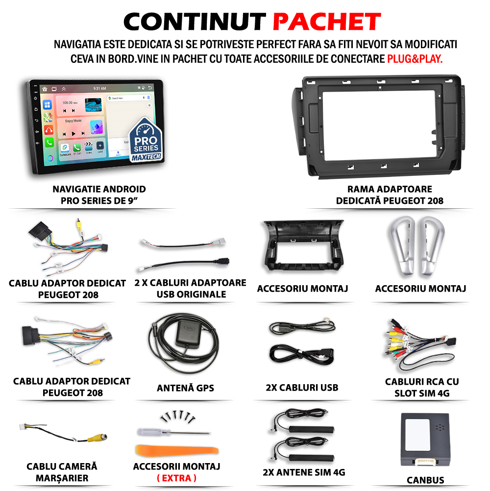 Navigatie Peugeot 208 2012-2019 dedicata, MaxTech® PRO SERIES, 8 GB Ram 128 GB Rom OctaCore, Carplay & Android auto, Ecran 10” HD Touch, SIM 4G, GPS, Wifi, Bluetooth, Radio, EQ, Waze