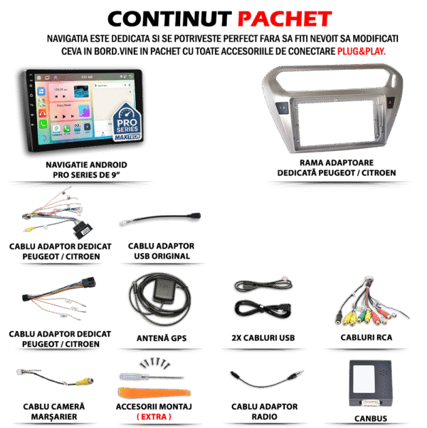 - Inainte de montaj, este esential ca toate componentele incluse in pachet sa fie verificate cu atentie. Conectorii trebuie sa corespunda cu cei ai vehiculului, iar eventualele module CANBUS, adaptoarele pentru comenzile de pe volan sau extensiile auxiliare (USB, RCA etc.) trebuie instalate conform specificatiilor tehnice.