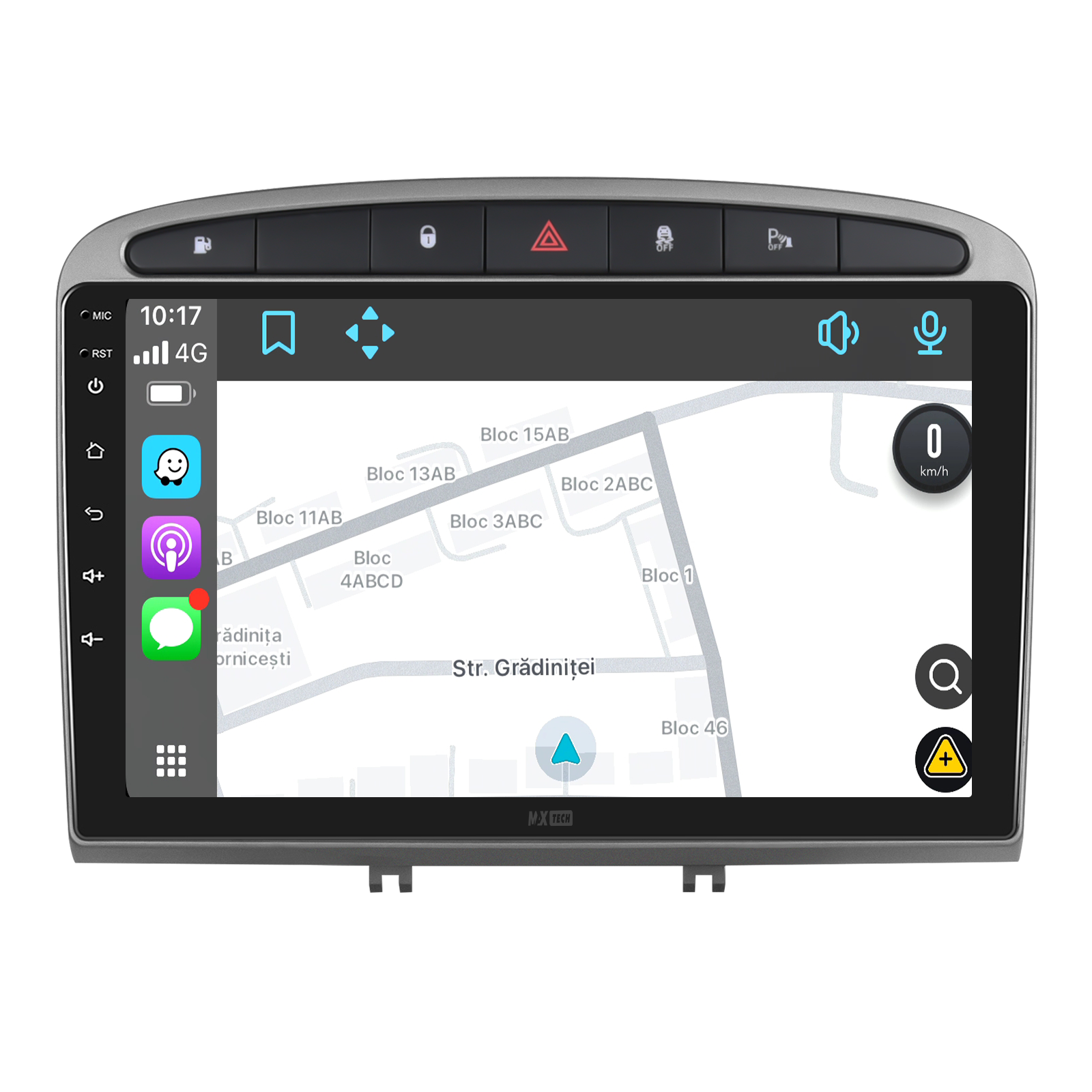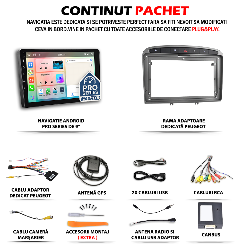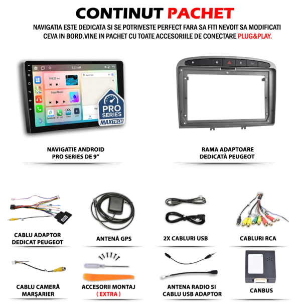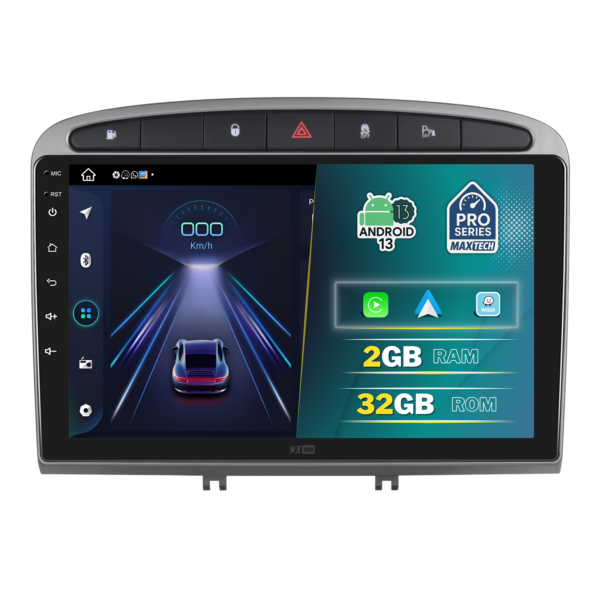 Navigatie Peugeot 308/408 (2007-2015) dedicata, MaxTech® PRO SERIES, 2 GB Ram 32 GB Rom, Carplay & Android auto, Ecran 9 ” HD Touch, GPS, Wifi, Bluetooth, Radio, USB, EQ, DSP, Waze