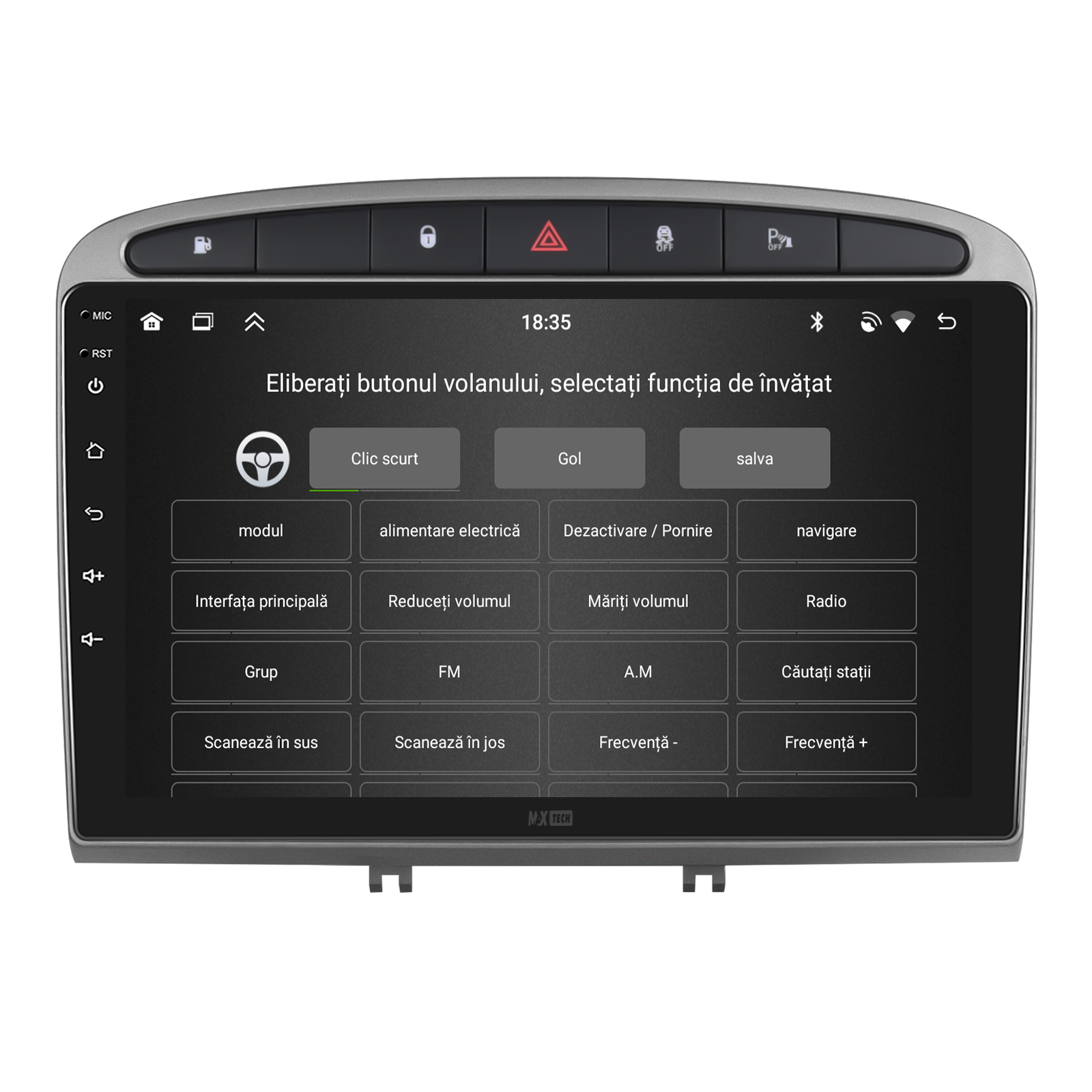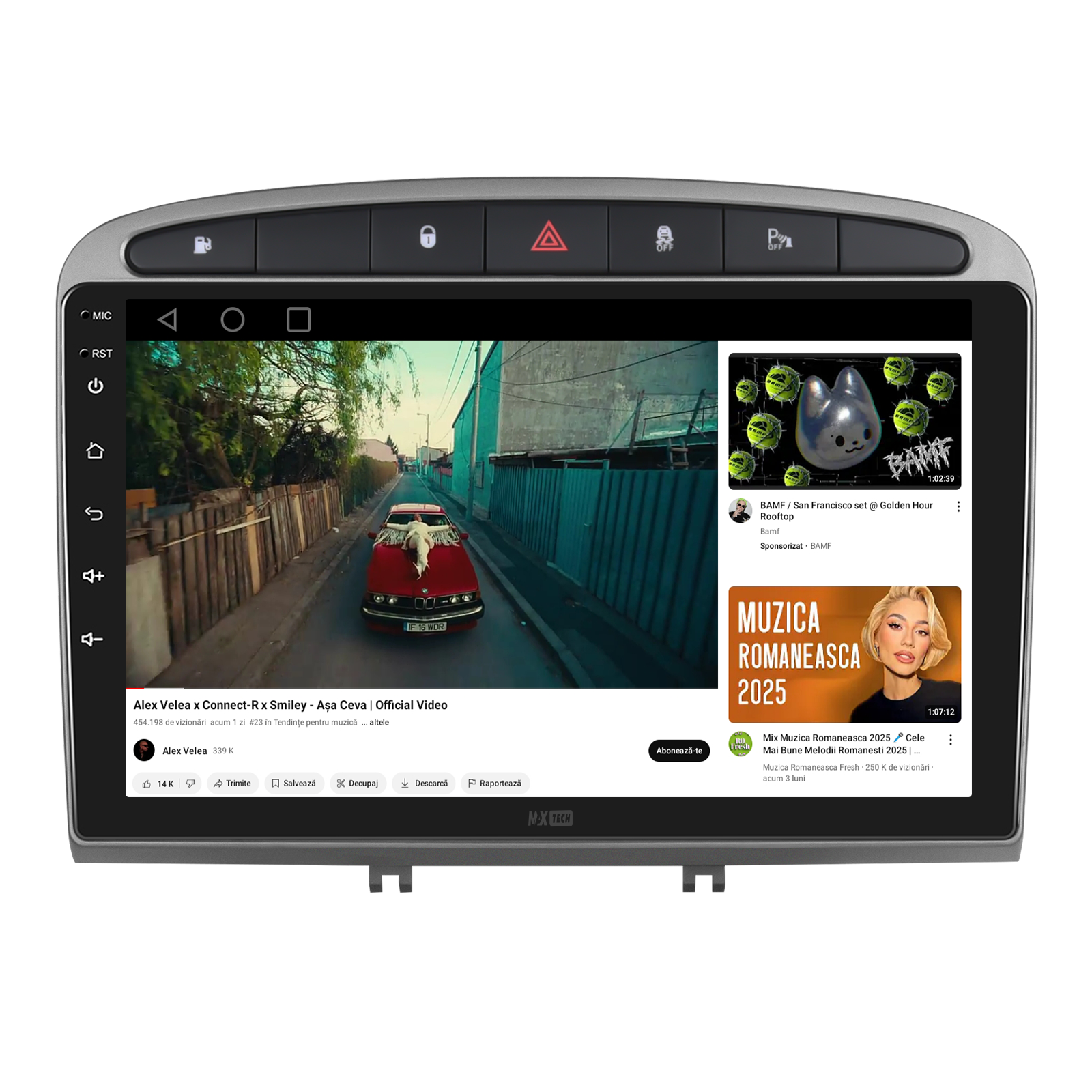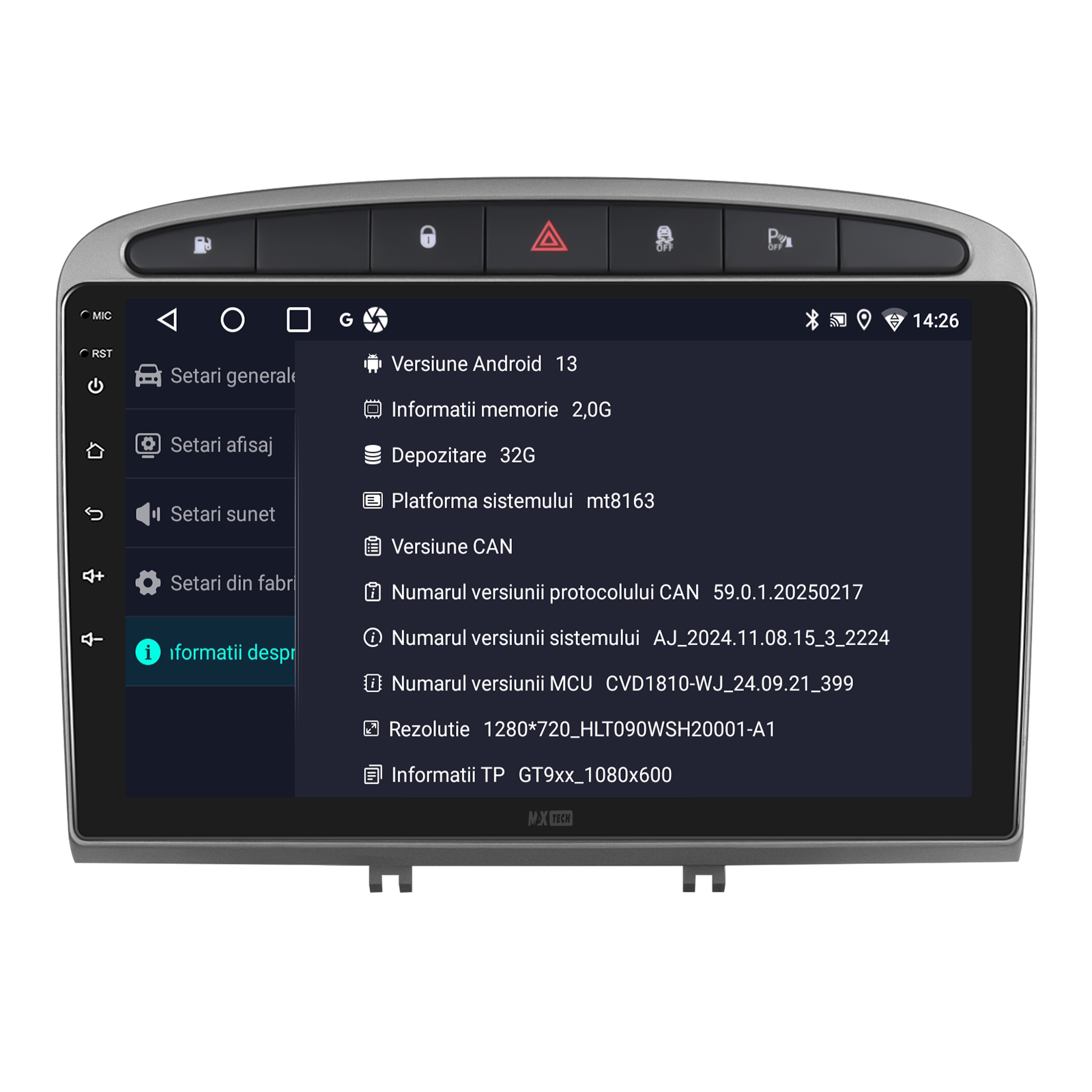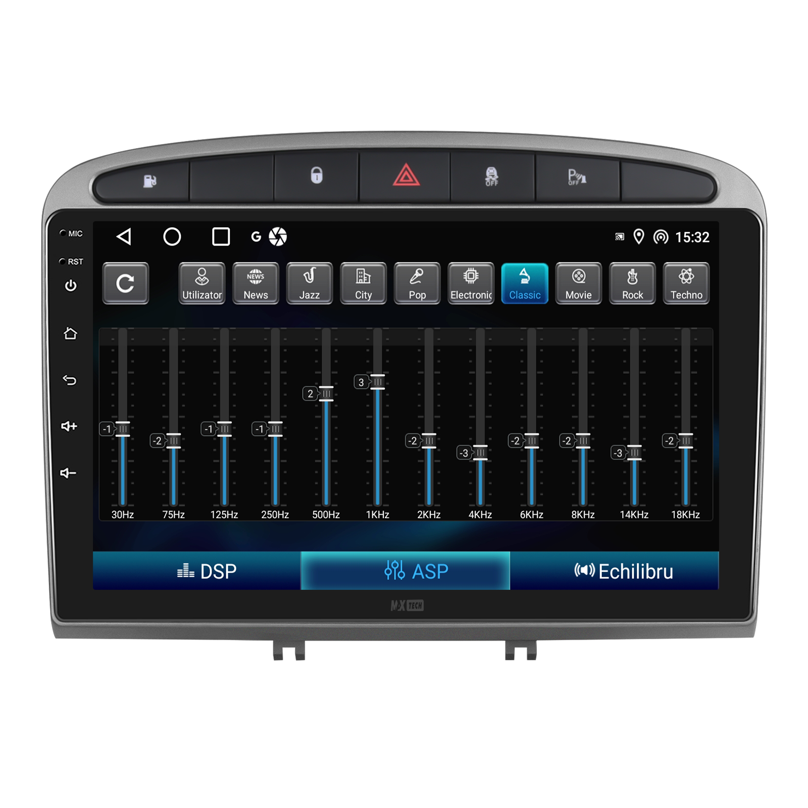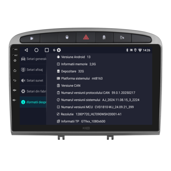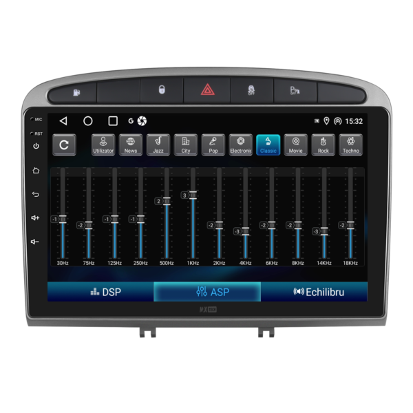 Sistemul include radio RDS cu afisare post si melodie, comutare automata pe frecventa cea mai buna si procesare audio DSP cu egalizator si filtru activ pentru sunet clar, echilibrat si personalizabil.