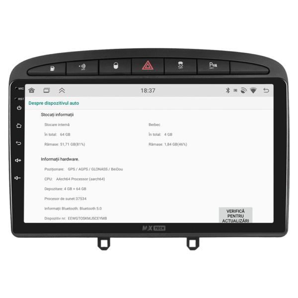 Sistemul include radio RDS cu afisare post si melodie, comutare automata pe frecventa cea mai buna si procesare audio DSP cu egalizator si filtru activ pentru sunet clar, echilibrat si personalizabil.