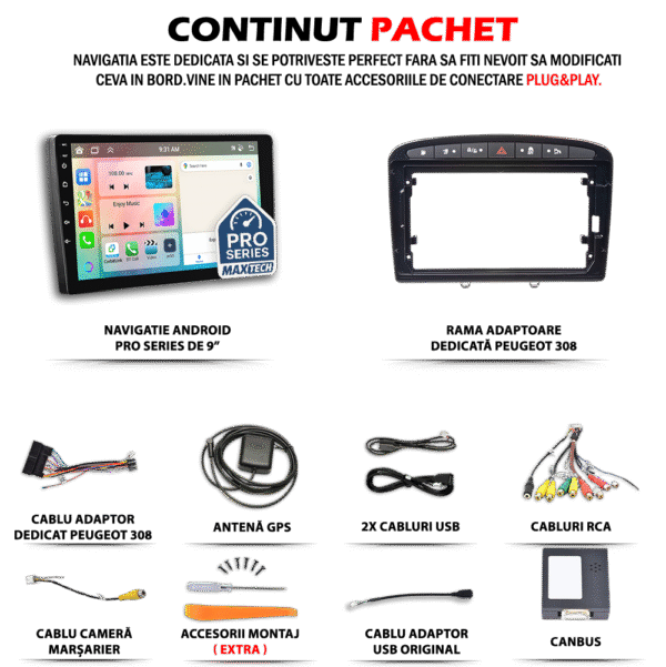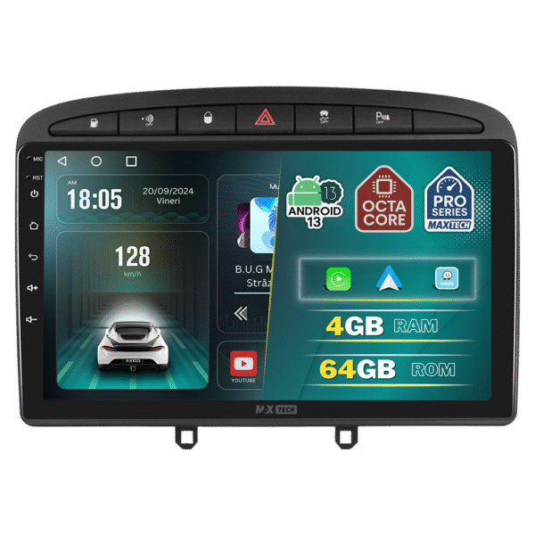 Navigatie Peugeot 308 ( 2007-2014 ) dedicata, MaxTech® PRO SERIES, 4 GB Ram 64 GB Rom OctaCore, Carplay & Android auto, Ecran 9 ” HD Touch, GPS, Wifi, Bluetooth, Radio, USB, EQ, DSP, Waze