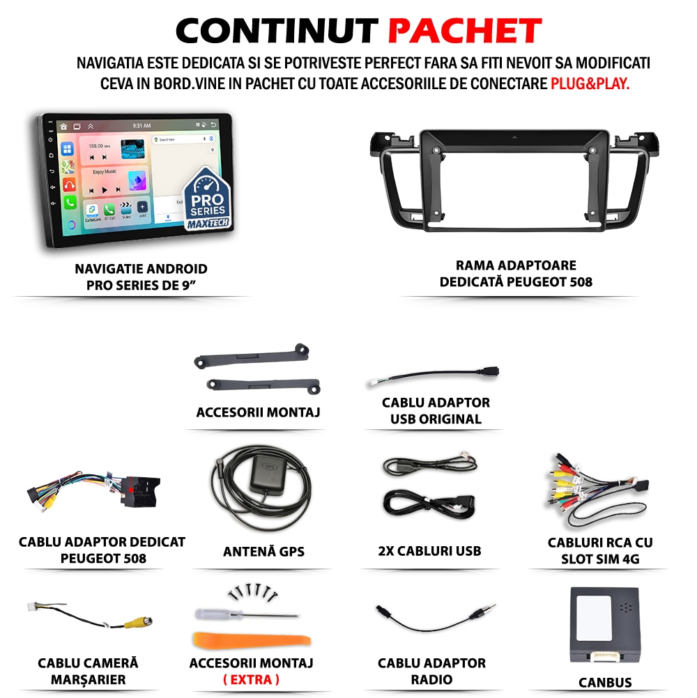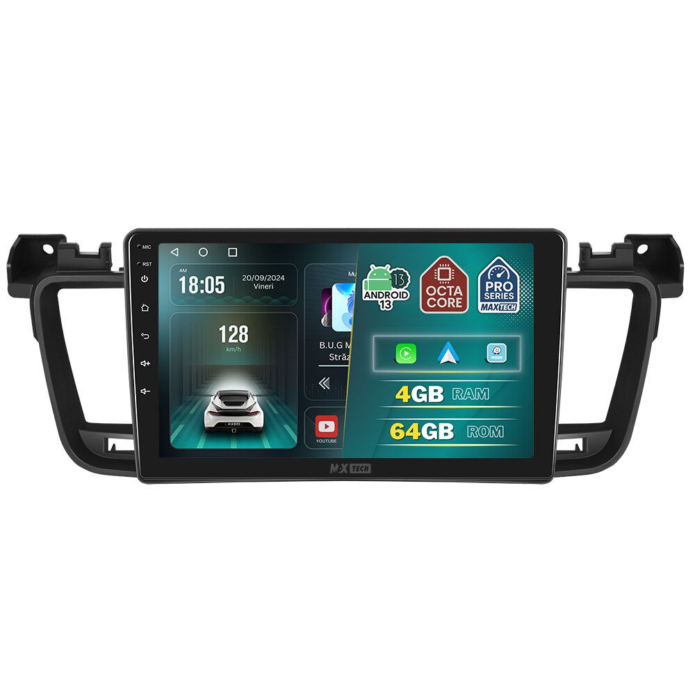 Navigatie Peugeot 508 2011-2018 dedicata, MaxTech® PRO SERIES, 4 GB Ram 64 GB Rom OctaCore, Carplay & Android auto, Ecran 9 ” HD Touch, GPS, Wifi, Bluetooth, Radio, USB, EQ, DSP, Waze