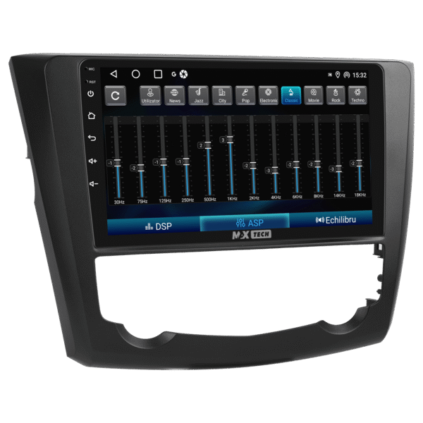 Sistemul include radio RDS cu afisare post si melodie, comutare automata pe frecventa cea mai buna si procesare audio DSP cu egalizator si filtru activ pentru sunet clar, echilibrat si personalizabil.