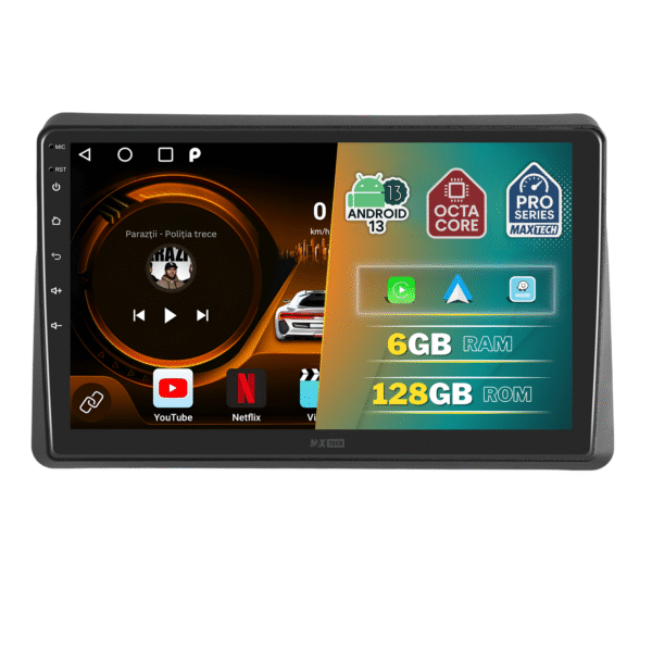 Sistemul MaxTech Pro Series este echipat cu un procesor OctaCore de tip 4+4, 6 GB RAM si 128 GB stocare, pentru multitasking rapid. Ecranul IPS HD de 1280×720 ofera culori reale si vizibilitate excelenta din orice unghi, cu design modern 2.5D.