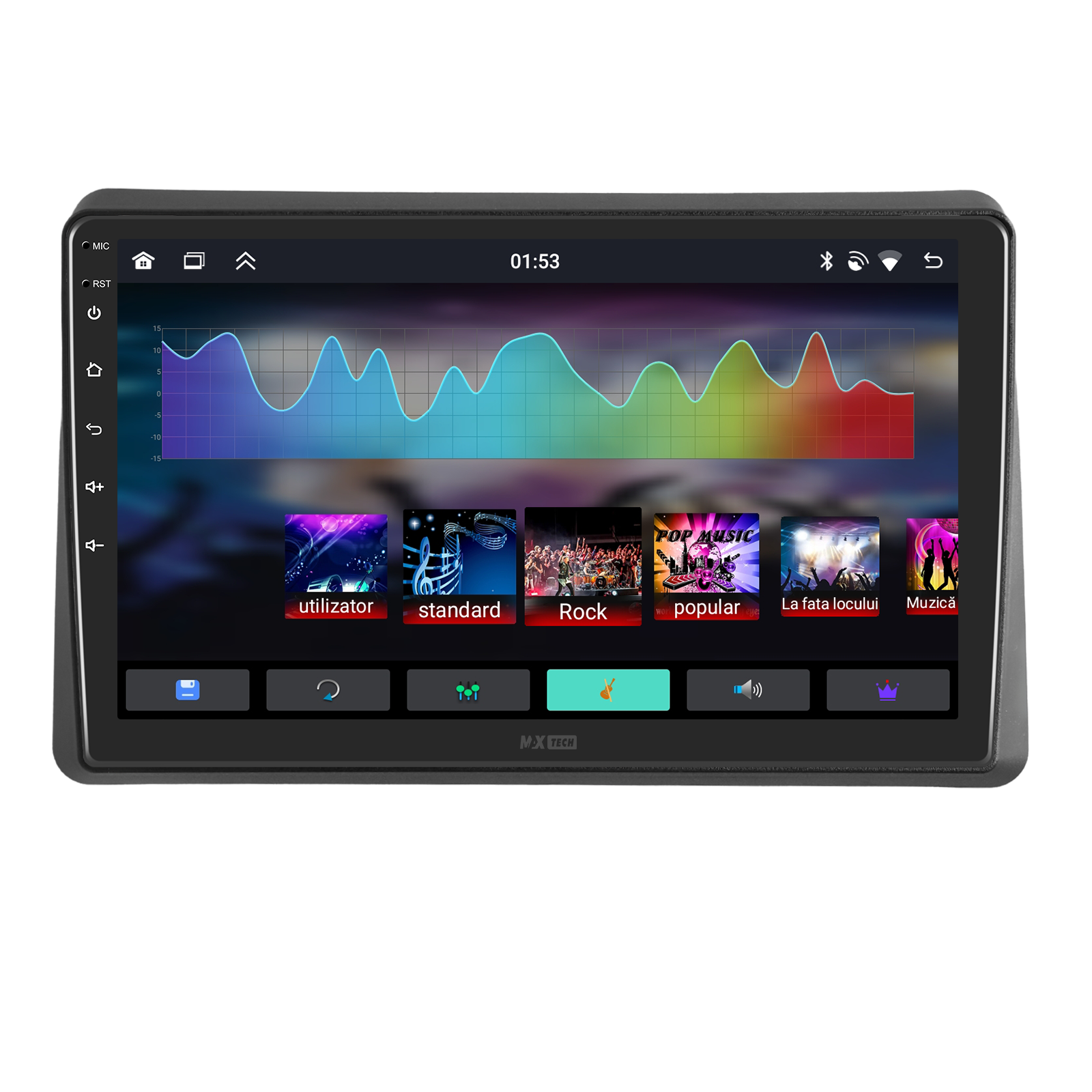 Sistemul include radio RDS cu afisare post si melodie, comutare automata pe frecventa cea mai buna si procesare audio DSP cu egalizator si filtru activ pentru sunet clar, echilibrat si personalizabil.