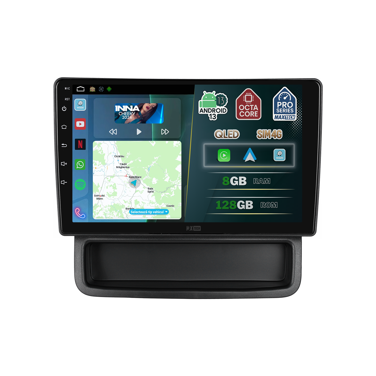Navigatie cu procesor 8-core la 2.5GHz, 8GB RAM si 128GB stocare. Ecran QLED 1280×720 cu sunet Hi-Res (DSP ADI) pentru performanta rapida si vizualizare clara.