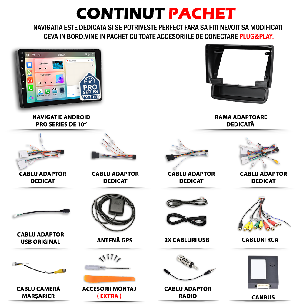 - Inainte de montaj, este esential ca toate componentele incluse in pachet sa fie verificate cu atentie. Conectorii trebuie sa corespunda cu cei ai vehiculului, iar eventualele module CANBUS, adaptoarele pentru comenzile de pe volan sau extensiile auxiliare (USB, RCA etc.) trebuie instalate conform specificatiilor tehnice.