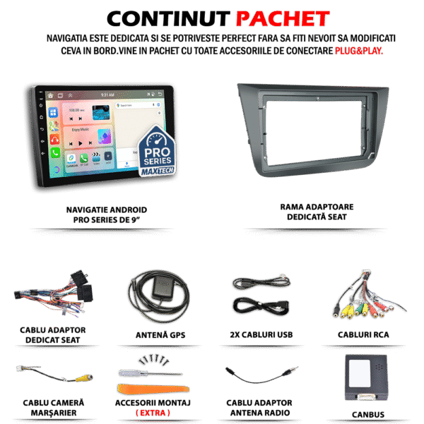 Navigatie Seat Altea / Toledo 2004-2015 dedicata, MaxTech® PRO SERIES, 4 GB Ram 64 GB Rom OctaCore, Carplay & Android auto, Ecran 9 ” HD Touch, GPS, Wifi, Bluetooth, Radio, USB, EQ, DSP, Waze