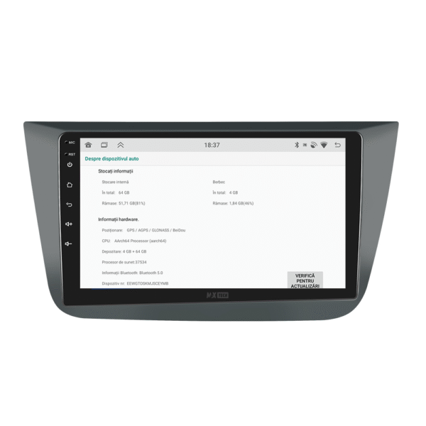 Sistemul MaxTech ProSeries este echipat cu un procesor OctaCore de tip 4+4, 4 GB RAM si 64 GB stocare, pentru multitasking rapid. Ecranul IPS HD de 1280×720 ofera culori reale si vizibilitate excelenta din orice unghi, cu design modern 2.5D.
