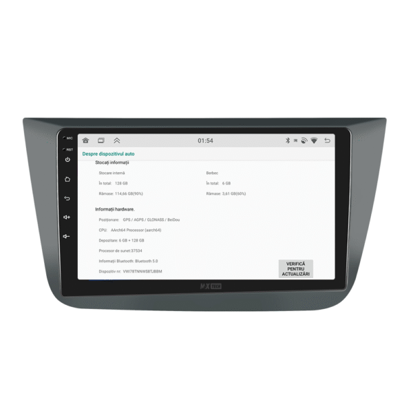 Sistemul MaxTech Pro Series este echipat cu un procesor OctaCore de tip 4+4, 6 GB RAM si 128 GB stocare, pentru multitasking rapid. Ecranul IPS HD de 1280×720 ofera culori reale si vizibilitate excelenta din orice unghi, cu design modern 2.5D.