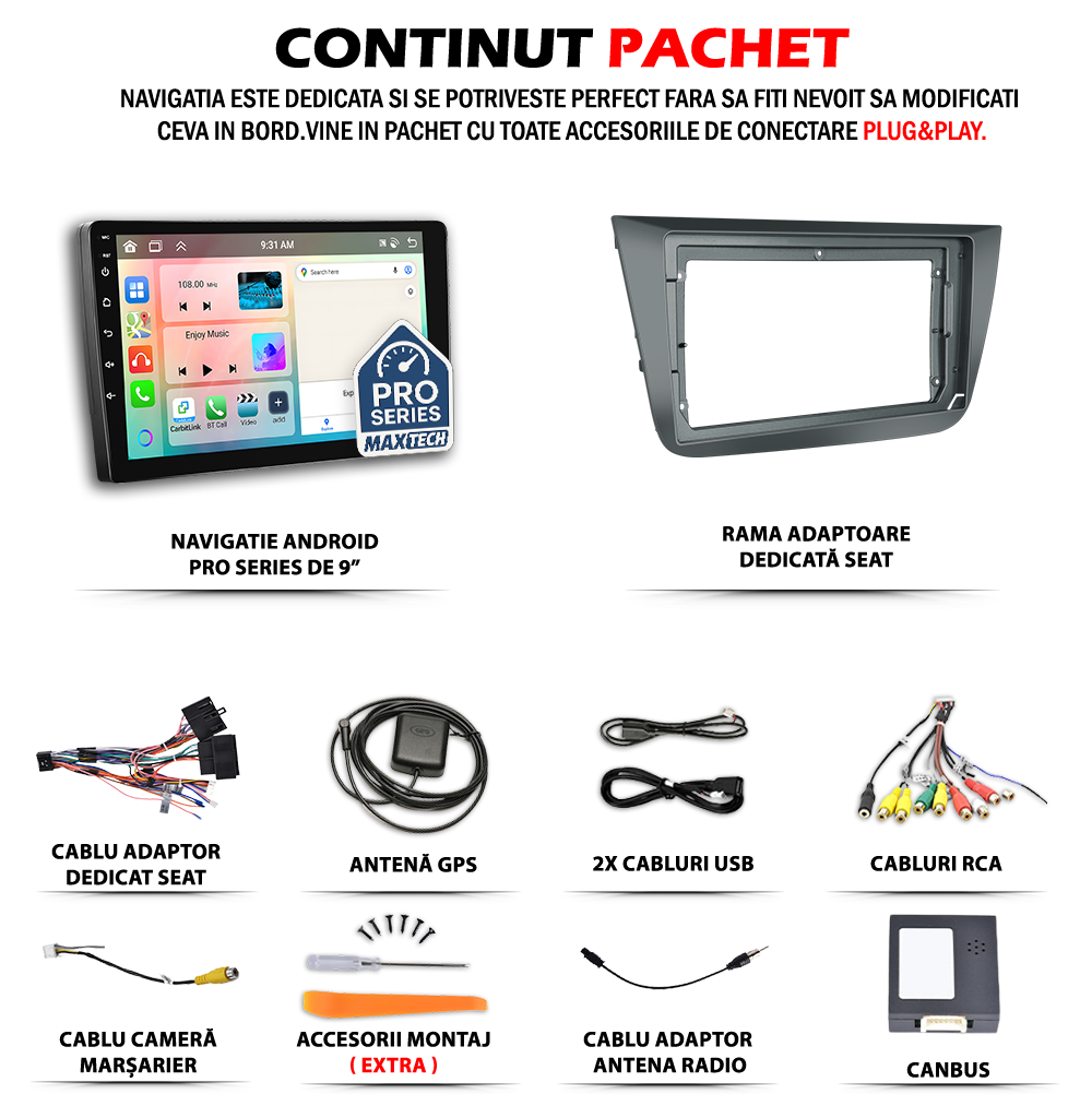 Navigatie Seat Altea / Toledo 2004-2015 dedicata, MaxTech® PRO SERIES, 6 GB Ram 128 GB Rom OctaCore, Carplay & Android auto, Ecran 9” HD Touch, GPS, Wifi, Bluetooth, Radio, USB, EQ, DSP, Waze