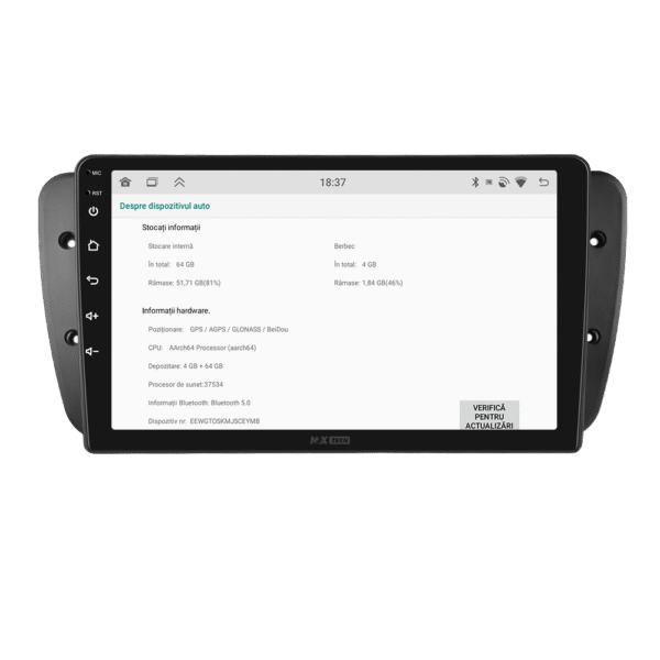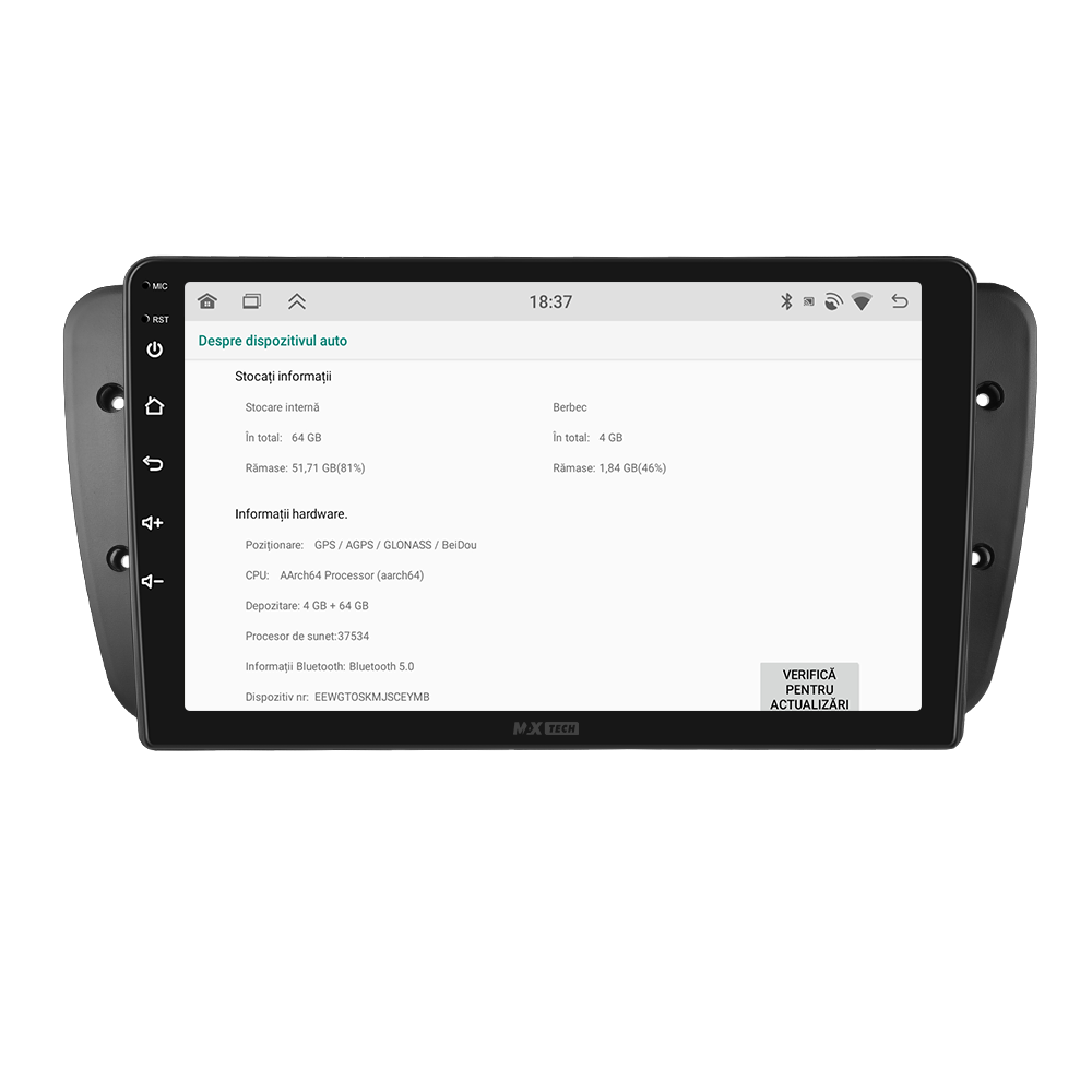 Sistemul MaxTech ProSeries este echipat cu un procesor OctaCore de tip 4+4, 4 GB RAM si 64 GB stocare, pentru multitasking rapid. Ecranul IPS HD de 1280×720 ofera culori reale si vizibilitate excelenta din orice unghi, cu design modern 2.5D.