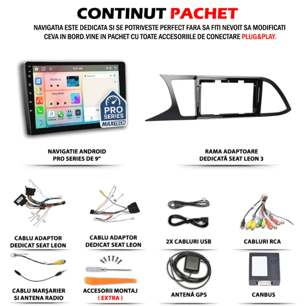 Navigatie Seat Leon 3 facelift (2017-2019) dedicata, MaxTech® PRO SERIES, 2 GB Ram 32 GB Rom, Carplay & Android auto, Ecran 9 ” HD Touch, GPS, Wifi, Bluetooth, Radio, USB, EQ, DSP, Waze, Youtube