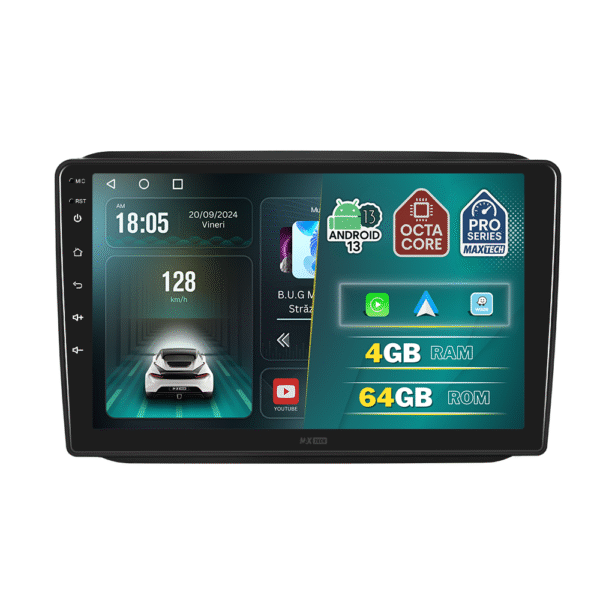 Sistemul MaxTech ProSeries este echipat cu un procesor OctaCore de tip 4+4, 4 GB RAM si 64 GB stocare, pentru multitasking rapid. Ecranul IPS HD de 1280×720 ofera culori reale si vizibilitate excelenta din orice unghi, cu design modern 2.5D.