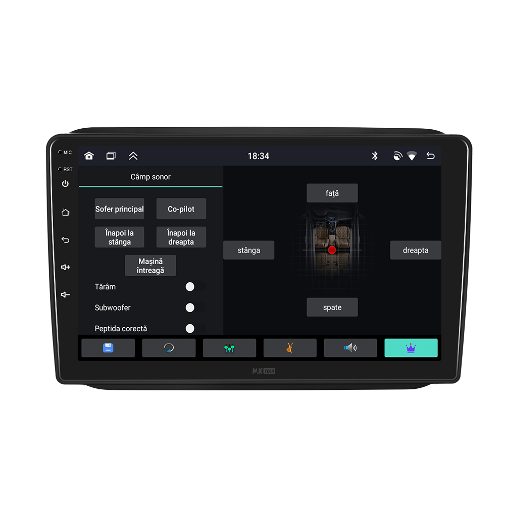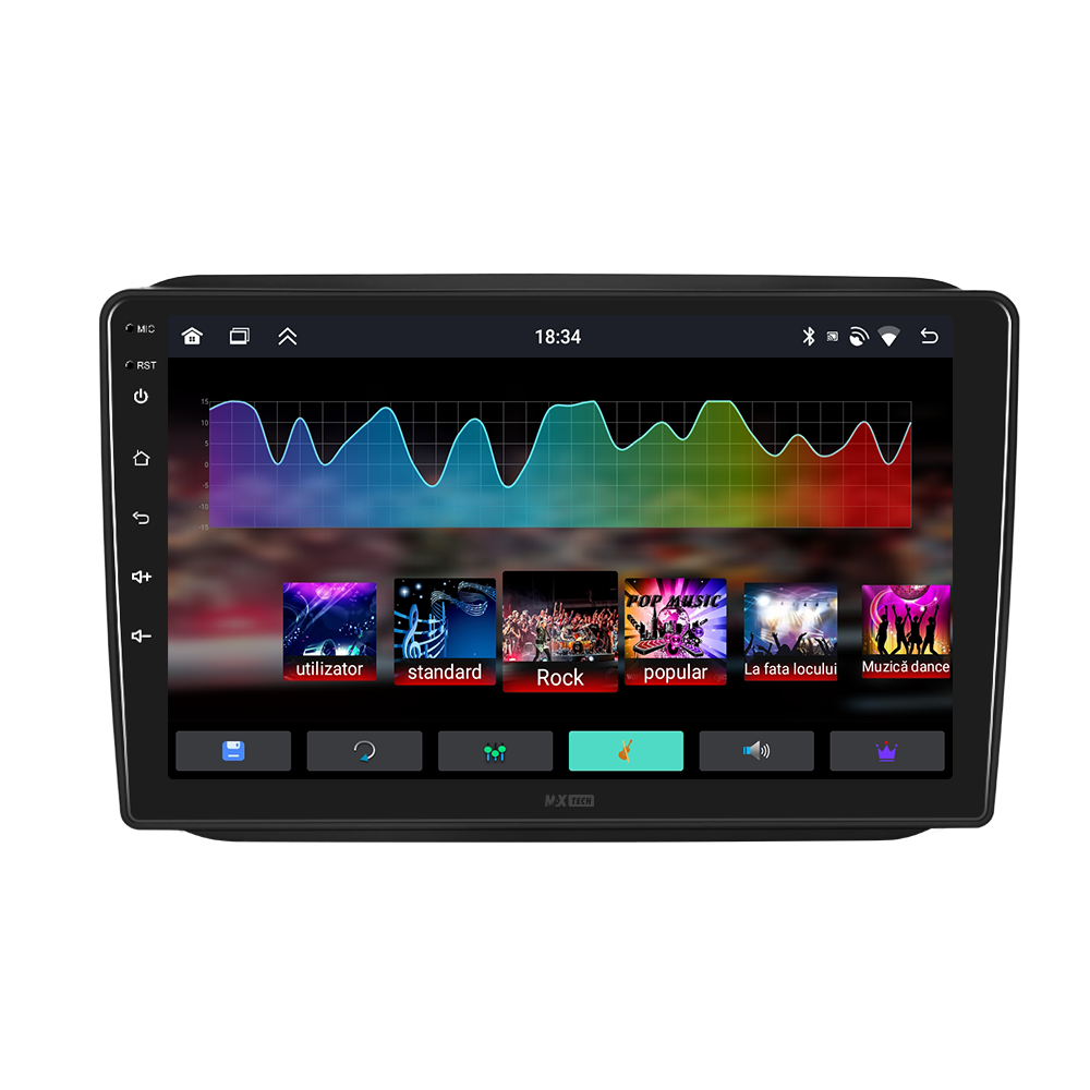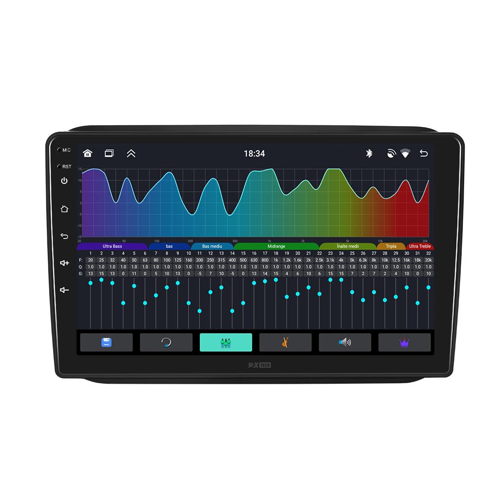 Sistemul include radio RDS cu afisare post si melodie, comutare automata pe frecventa cea mai buna si procesare audio DSP cu egalizator si filtru activ pentru sunet clar, echilibrat si personalizabil.
