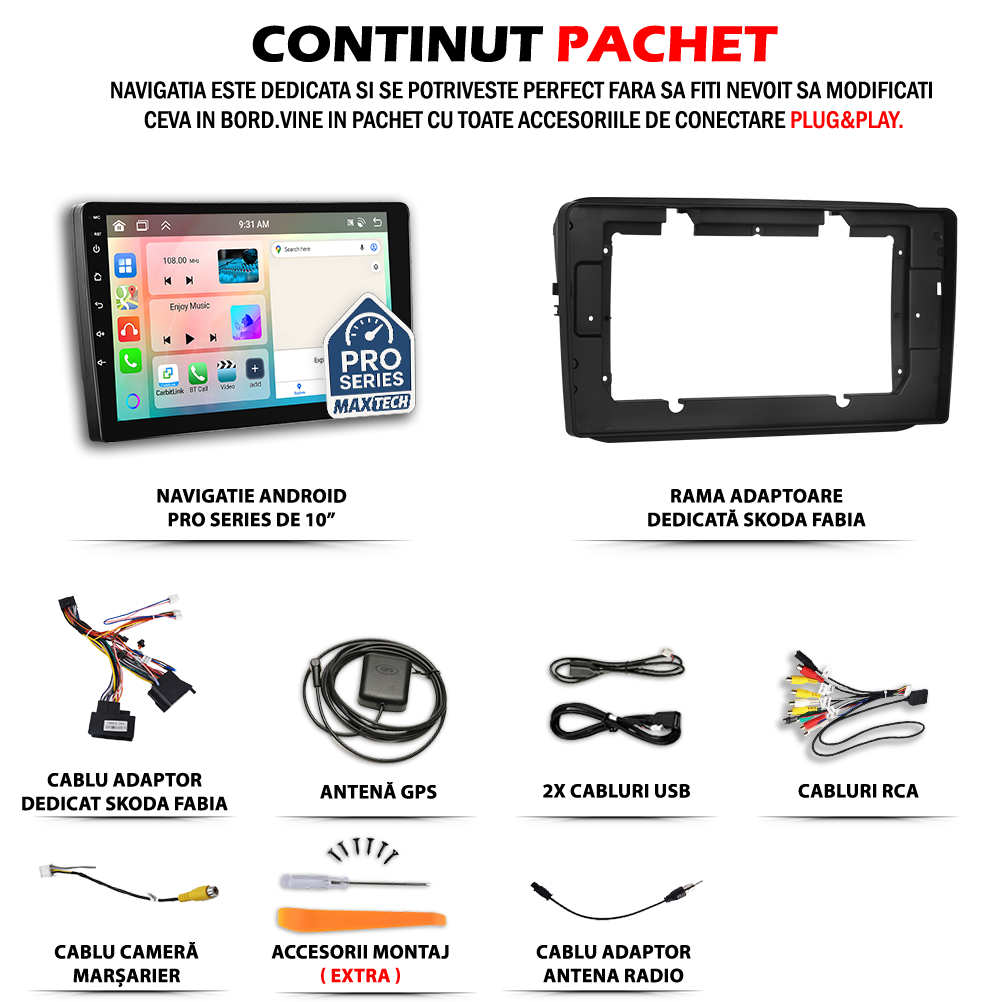 Navigatie Skoda Fabia 2, Roomster 2007-2015 dedicata, MaxTech® PRO SERIES, 4 GB Ram 64 GB Rom OctaCore, Carplay & Android auto, Ecran 10 ” HD Touch, GPS, Wifi, Bluetooth, Radio, USB, EQ, Waze