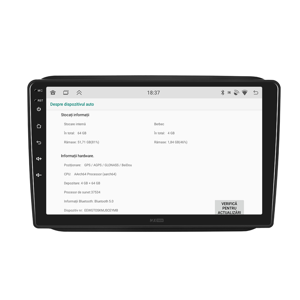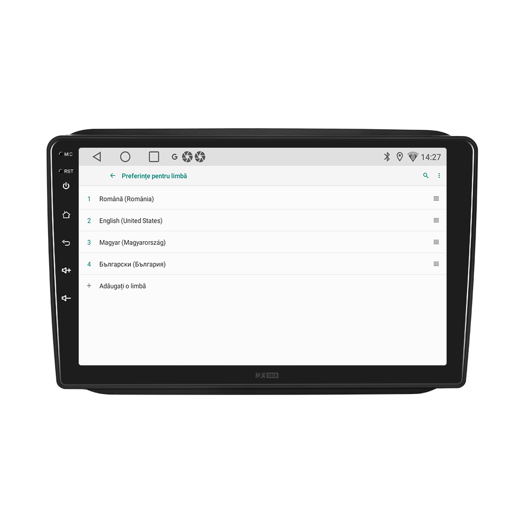Sistemul MaxTech ProSeries este echipat cu un procesor OctaCore de tip 4+4, 4 GB RAM si 64 GB stocare, pentru multitasking rapid. Ecranul IPS HD de 1280×720 ofera culori reale si vizibilitate excelenta din orice unghi, cu design modern 2.5D.