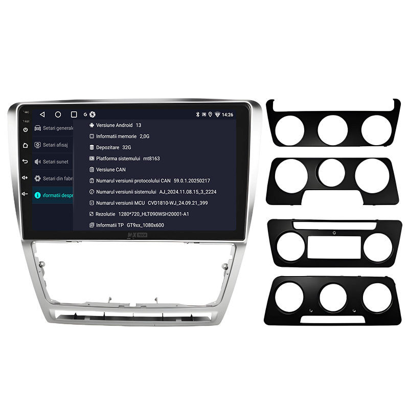 Sistemul include radio RDS cu afisare post si melodie, comutare automata pe frecventa cea mai buna si procesare audio DSP cu egalizator si filtru activ pentru sunet clar, echilibrat si personalizabil.