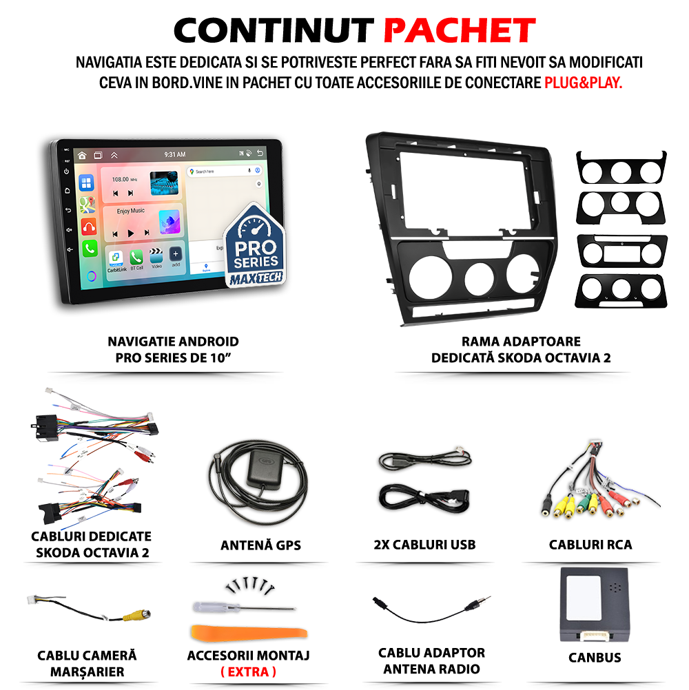 Navigatie Skoda Octavia 2 pre-facelift (2004–2008) dedicata, MaxTech® PRO SERIES, 2 GB Ram 32 GB Rom, Carplay & Android auto, Ecran 10” HD Touch, GPS, Wifi, Bluetooth, Radio, USB, EQ, DSP, Waze
