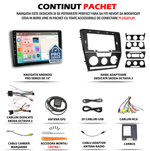 Navigatie Skoda Octavia 2 pre-facelift (2004–2008) dedicata, MaxTech® PRO SERIES, 8 GB Ram 128 GB Rom OctaCore, Carplay & Android auto, Ecran 10” HD Touch, SIM 4G, GPS, Wifi, Bluetooth, Radio