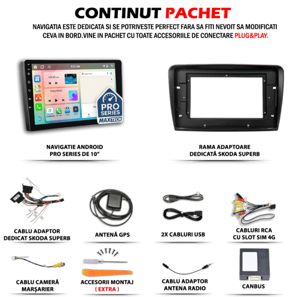 Navigatie Skoda Superb 2 (2009-2013) dedicata, MaxTech® PRO SERIES, 8 GB Ram 128 GB Rom OctaCore, Carplay & Android auto, Ecran 10” HD Touch, SIM 4G, GPS, Wifi, Bluetooth, Radio, EQ, Waze