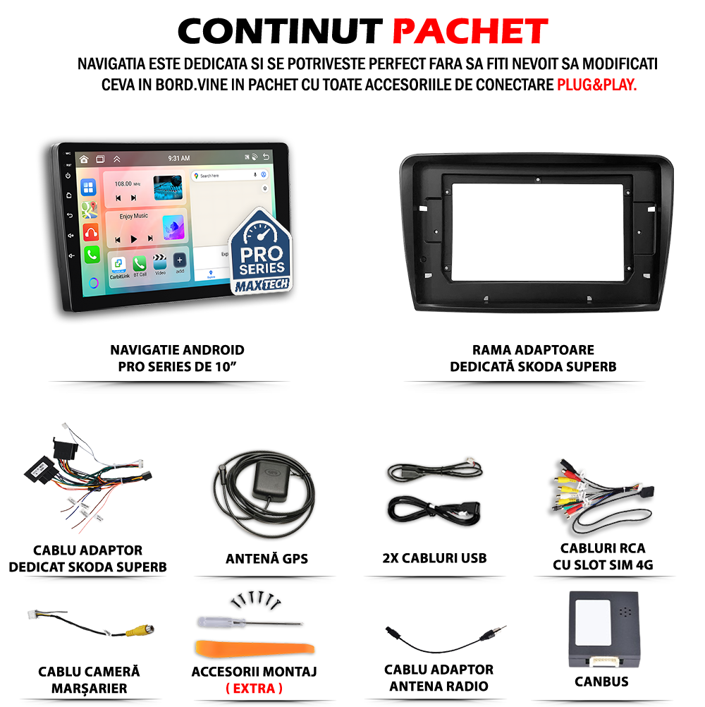 Navigatie Skoda Superb 2 (2009-2013) dedicata, MaxTech® PRO SERIES, 8 GB Ram 128 GB Rom OctaCore, Carplay & Android auto, Ecran 10” HD Touch, SIM 4G, GPS, Wifi, Bluetooth, Radio, EQ, Waze