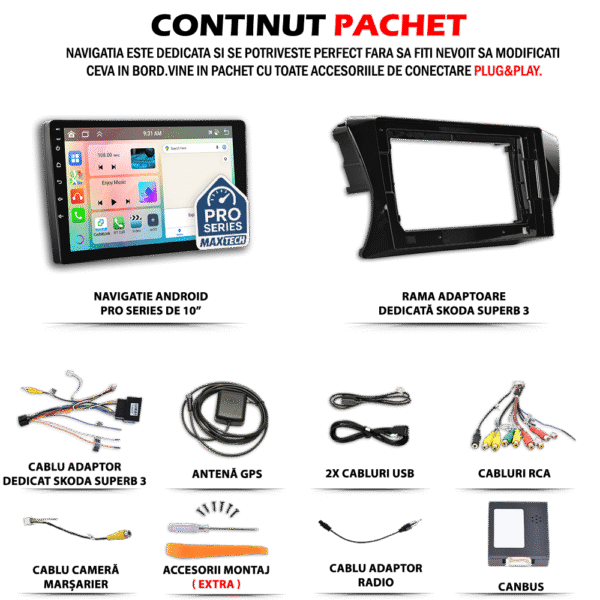 Navigatie Skoda Superb 3 2015-2019 dedicata, MaxTech® PRO SERIES, 6 GB Ram 128 GB Rom OctaCore, Carplay & Android auto, Ecran 10” HD Touch, GPS, Wifi, Bluetooth, Radio, USB, EQ, DSP, Waze, Youtube