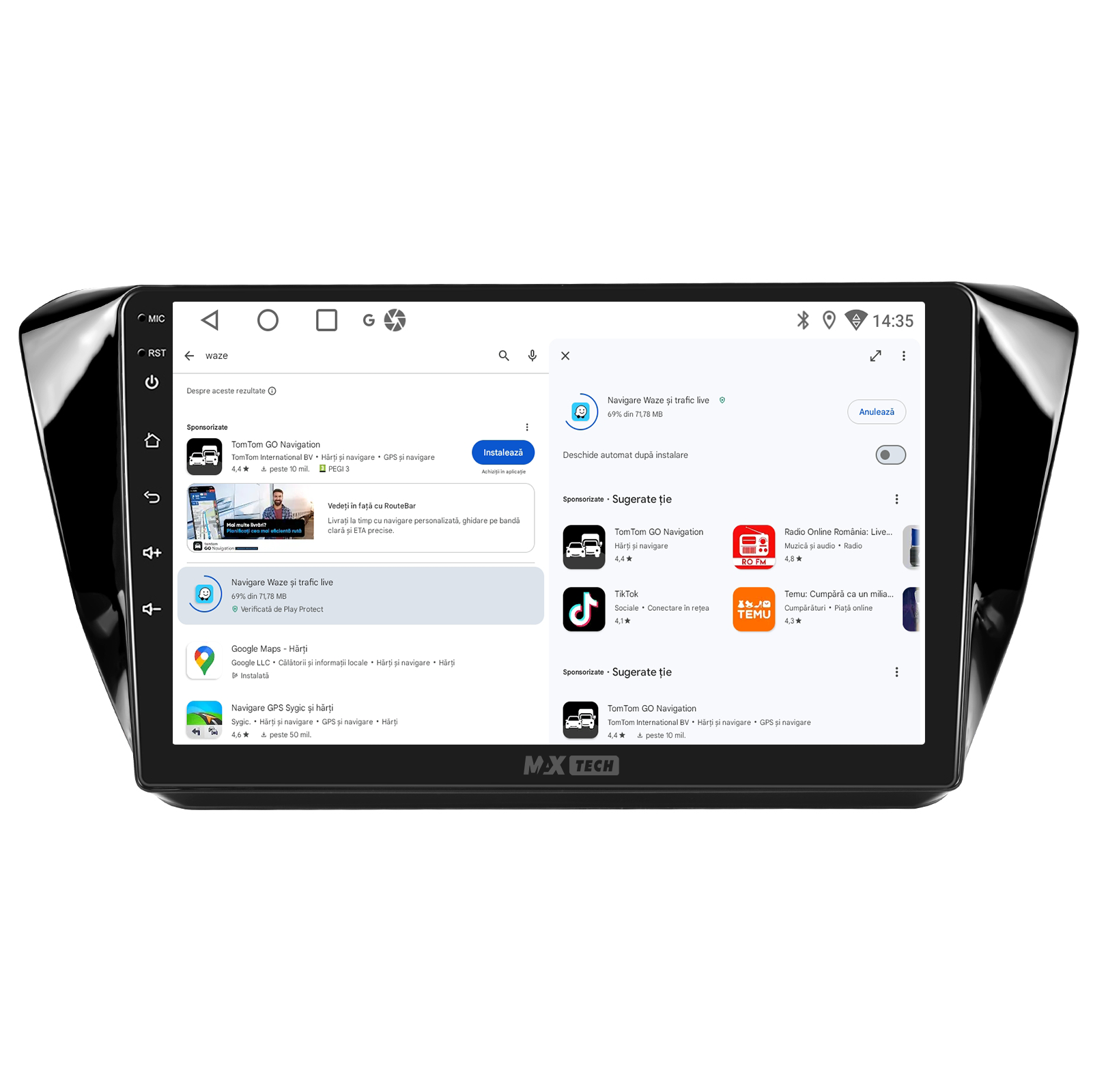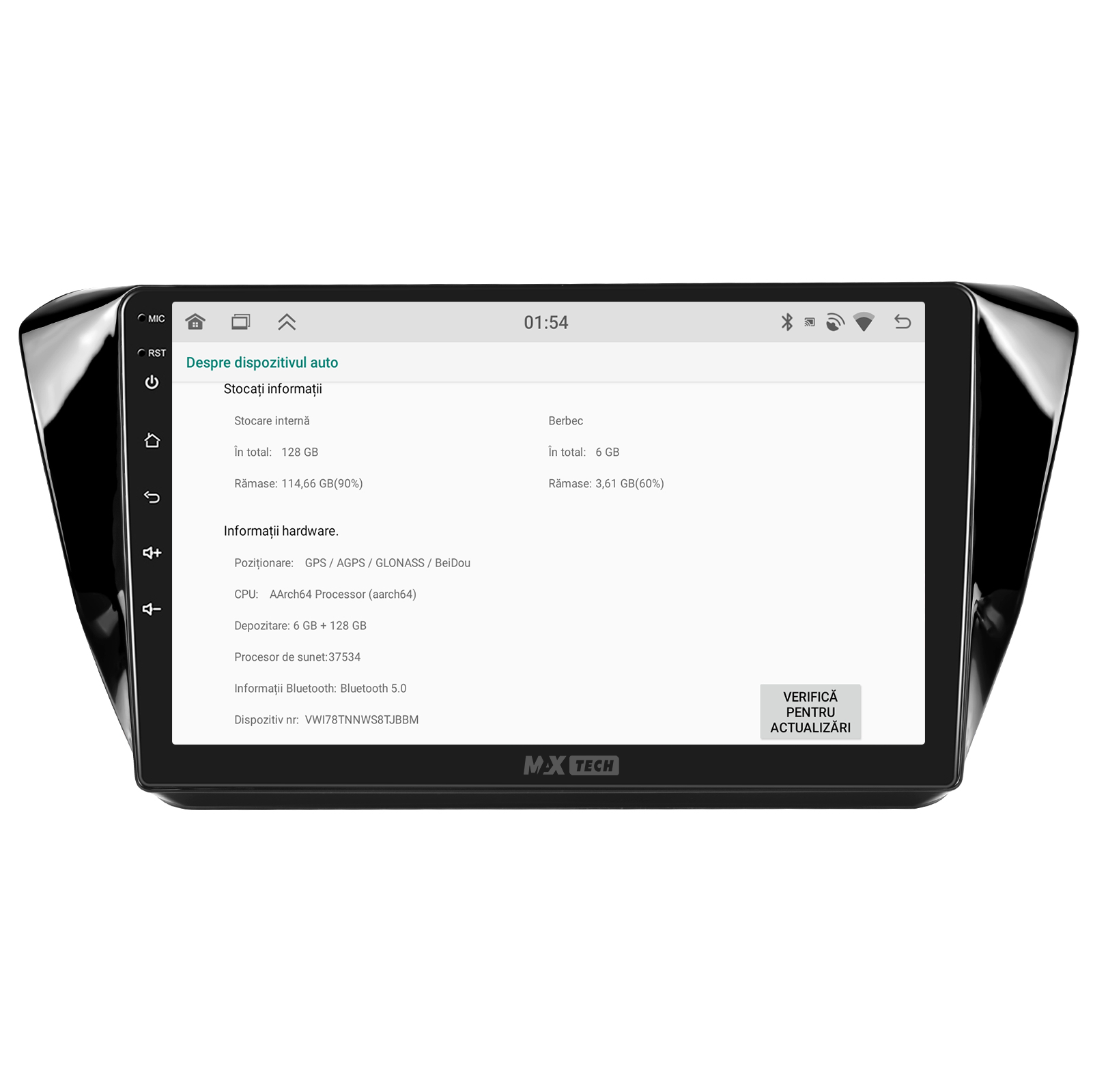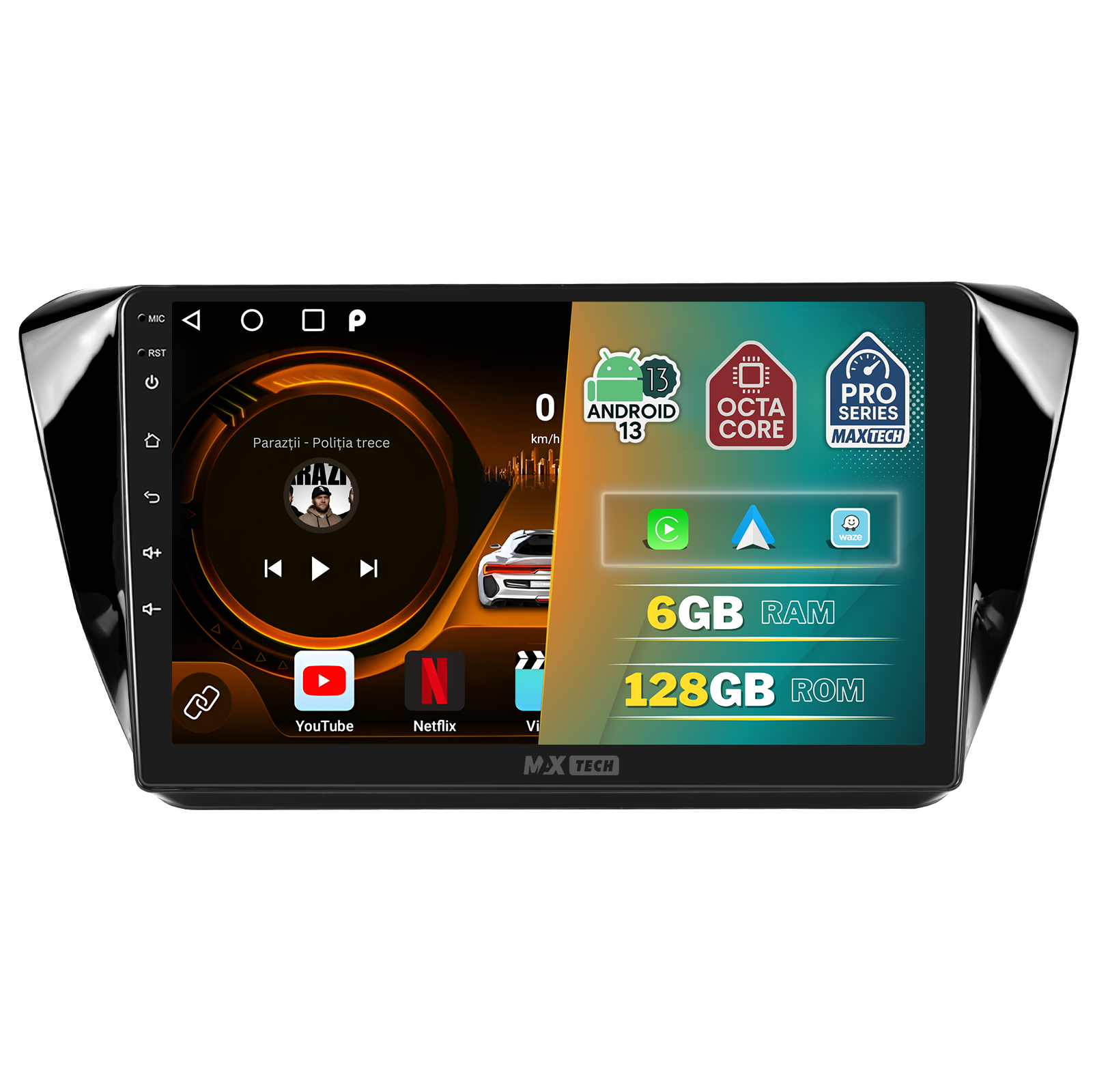 Sistemul MaxTech Pro Series este echipat cu un procesor OctaCore de tip 4+4, 6 GB RAM si 128 GB stocare, pentru multitasking rapid. Ecranul IPS HD de 1280×720 ofera culori reale si vizibilitate excelenta din orice unghi, cu design modern 2.5D.