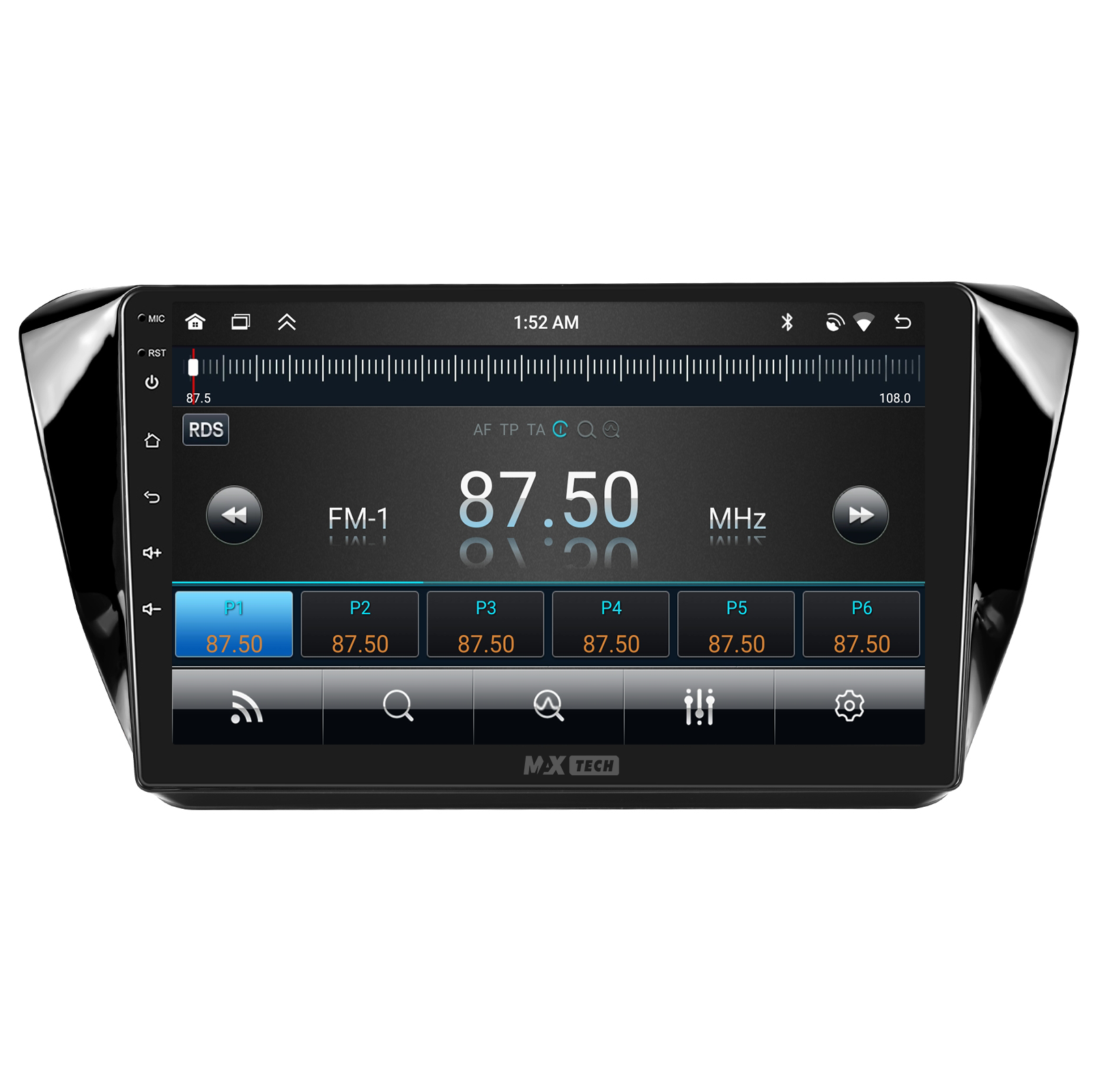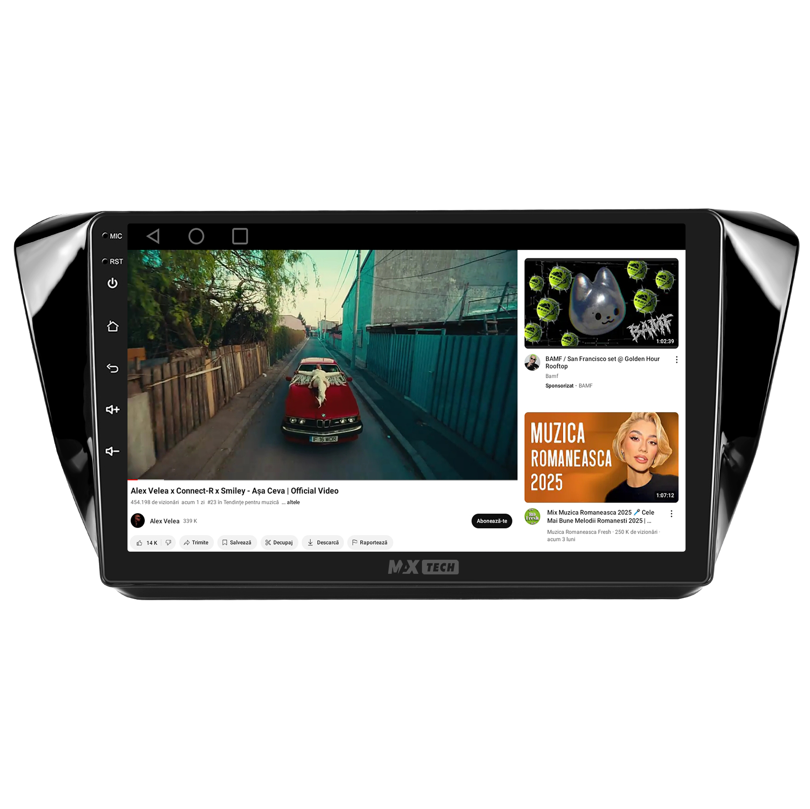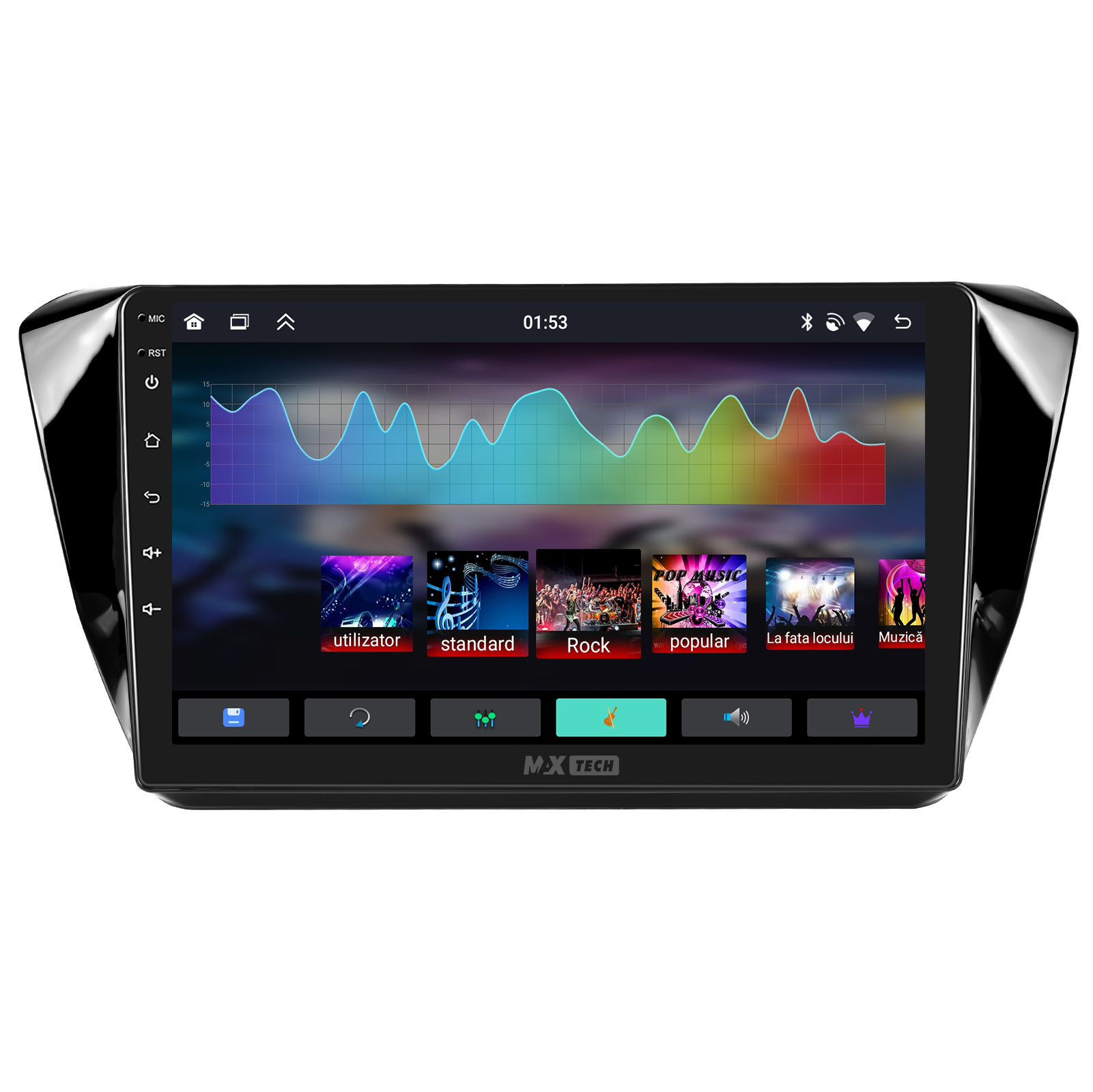 Sistemul include radio RDS cu afisare post si melodie, comutare automata pe frecventa cea mai buna si procesare audio DSP cu egalizator si filtru activ pentru sunet clar, echilibrat si personalizabil.