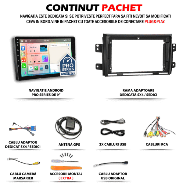 Navigatie Suzuki SX4 / Fiat Sedici 2006-2014 dedicata, MaxTech® PRO SERIES, 2 GB Ram 32 GB Rom, Carplay & Android auto, Ecran 9 ” HD Touch, GPS, Wifi, Bluetooth, Radio, USB, EQ, DSP, Waze, Youtube
