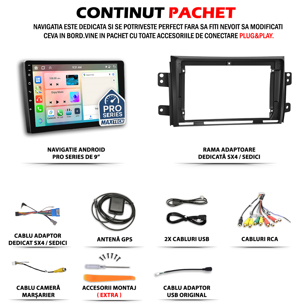 Navigatie Suzuki SX4 / Fiat Sedici 2006-2014 dedicata, MaxTech® PRO SERIES, 6 GB Ram 128 GB Rom OctaCore, Carplay & Android auto, Ecran 9” HD Touch, GPS, Wifi, Bluetooth, Radio, USB, EQ, DSP, Waze