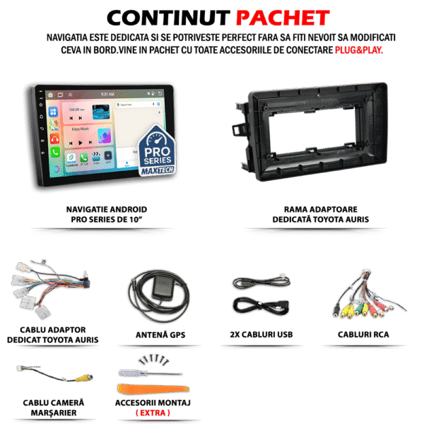 Navigatie Toyota Auris 2006-2012 dedicata, MaxTech® PRO SERIES, 4 GB Ram 64 GB Rom OctaCore, Carplay & Android auto, Ecran 10 ” HD Touch, GPS, Wifi, Bluetooth, Radio, USB, EQ, DSP, Waze