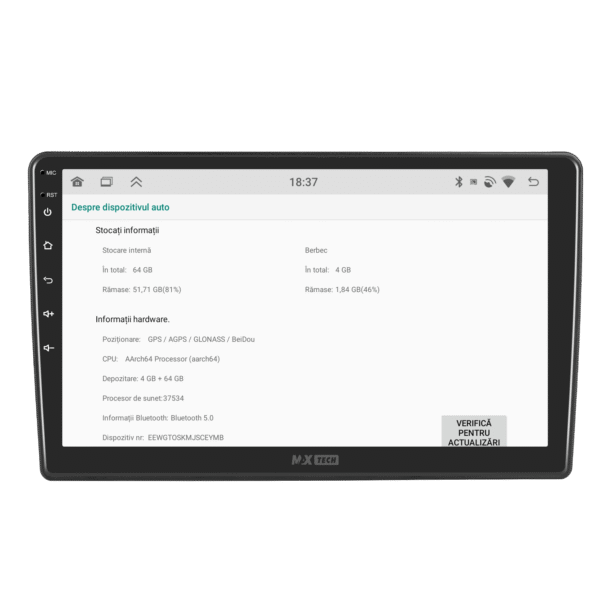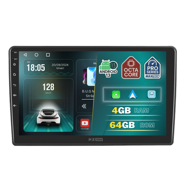 Sistemul MaxTech ProSeries este echipat cu un procesor OctaCore de tip 4+4, 4 GB RAM si 64 GB stocare, pentru multitasking rapid. Ecranul IPS HD de 1280×720 ofera culori reale si vizibilitate excelenta din orice unghi, cu design modern 2.5D.
