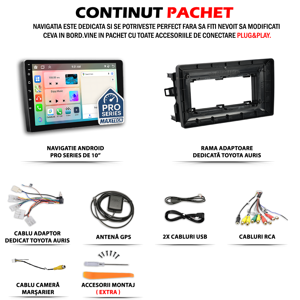 Navigatie Toyota Auris 2006-2012 dedicata, MaxTech® PRO SERIES, 4 GB Ram 64 GB Rom OctaCore, Carplay & Android auto, Ecran 10 ” HD Touch, GPS, Wifi, Bluetooth, Radio, USB, EQ, DSP, Waze
