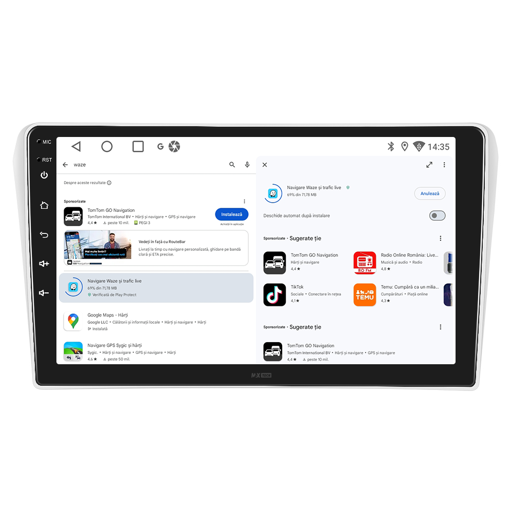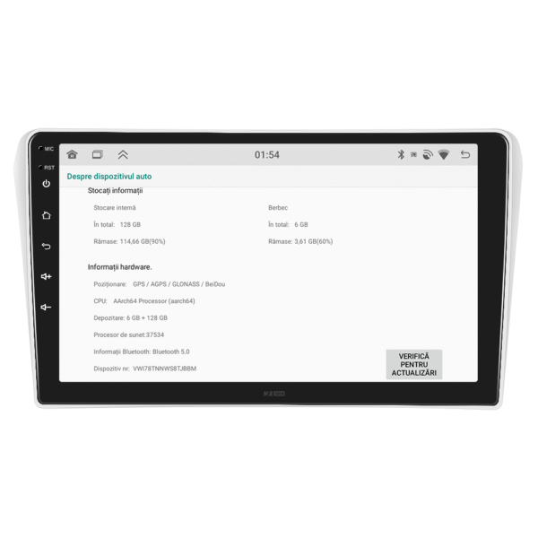 Sistemul MaxTech Pro Series este echipat cu un procesor OctaCore de tip 4+4, 6 GB RAM si 128 GB stocare, pentru multitasking rapid. Ecranul IPS HD de 1280×720 ofera culori reale si vizibilitate excelenta din orice unghi, cu design modern 2.5D.