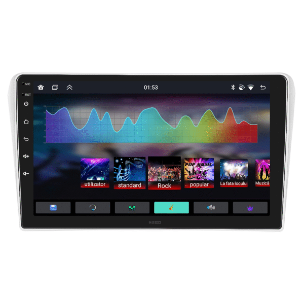Sistemul include radio RDS cu afisare post si melodie, comutare automata pe frecventa cea mai buna si procesare audio DSP cu egalizator si filtru activ pentru sunet clar, echilibrat si personalizabil.