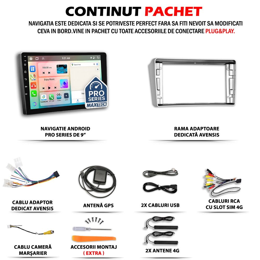 Navigatie Toyota Avensis T25 (2002-2008) dedicata, MaxTech® PRO SERIES, 8 GB Ram 128 GB Rom OctaCore, Carplay & Android auto, Ecran 9” HD Touch, SIM 4G, GPS, Wifi, Bluetooth, Radio, EQ, Youtube, Waze