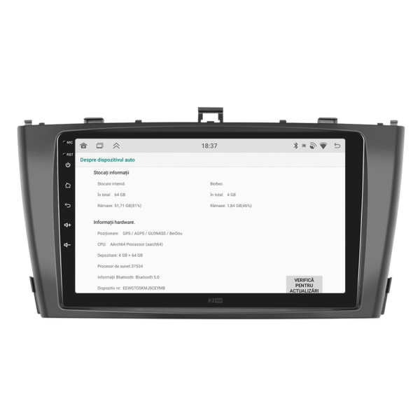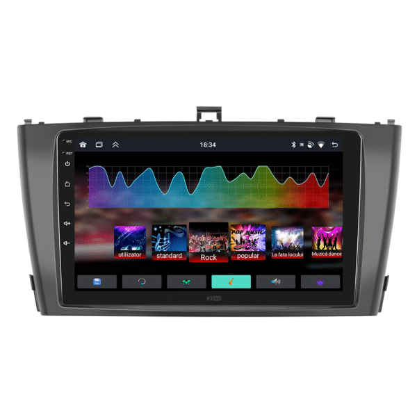 Sistemul include radio RDS cu afisare post si melodie, comutare automata pe frecventa cea mai buna si procesare audio DSP cu egalizator si filtru activ pentru sunet clar, echilibrat si personalizabil.