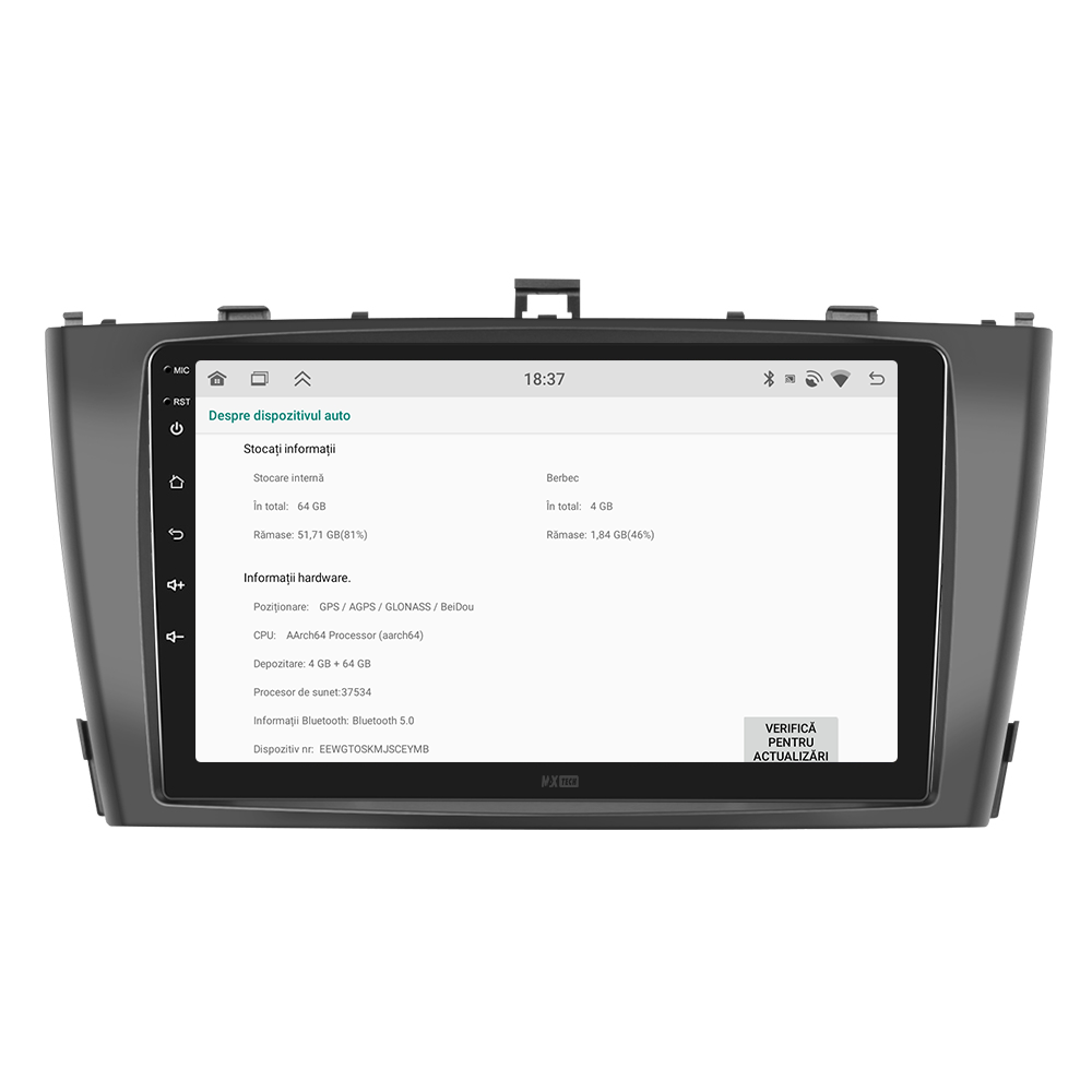 Sistemul MaxTech ProSeries este echipat cu un procesor OctaCore de tip 4+4, 4 GB RAM si 64 GB stocare, pentru multitasking rapid. Ecranul IPS HD de 1280×720 ofera culori reale si vizibilitate excelenta din orice unghi, cu design modern 2.5D.