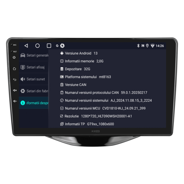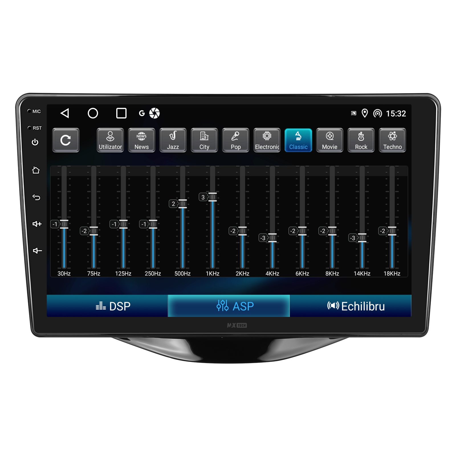 Sistemul include radio RDS cu afisare post si melodie, comutare automata pe frecventa cea mai buna si procesare audio DSP cu egalizator si filtru activ pentru sunet clar, echilibrat si personalizabil.
