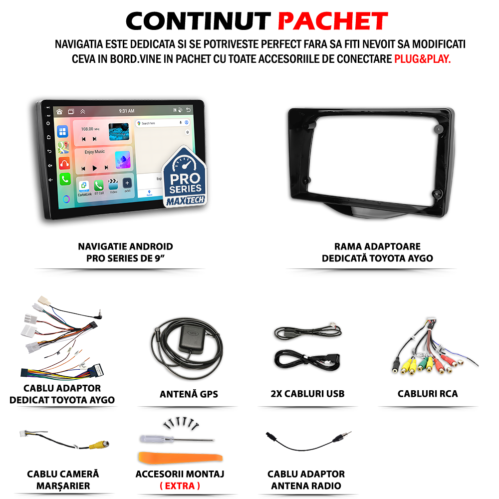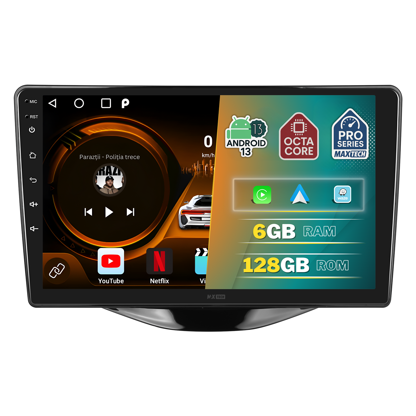 Navigatie Toyota Aygo/Peugeot 108/Citroen C1 (2014-2022) dedicata, MaxTech® PRO SERIES, 6 GB Ram 128 GB Rom OctaCore, Carplay & Android auto, Ecran 9” HD Touch, GPS, Wifi, Bluetooth, Radio, Waze