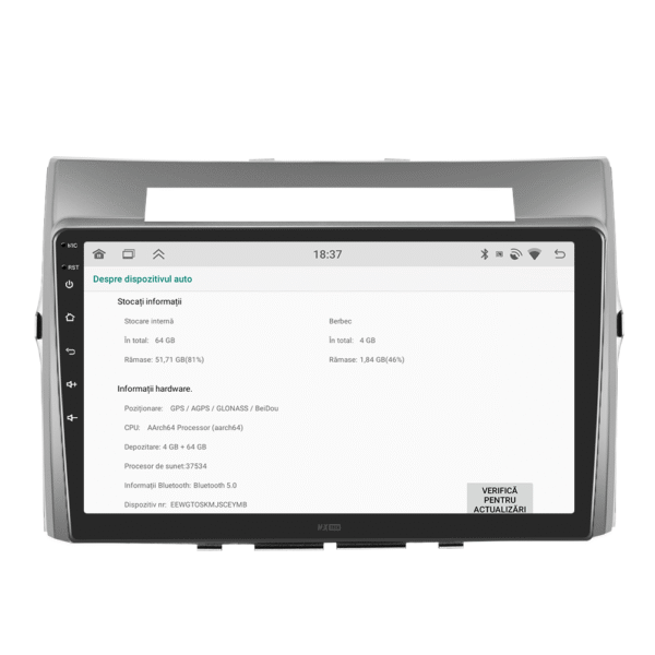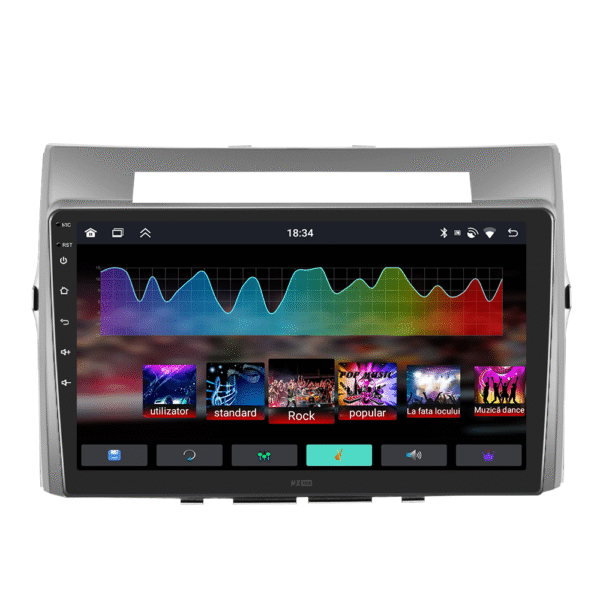 Sistemul include radio RDS cu afisare post si melodie, comutare automata pe frecventa cea mai buna si procesare audio DSP cu egalizator si filtru activ pentru sunet clar, echilibrat si personalizabil.
