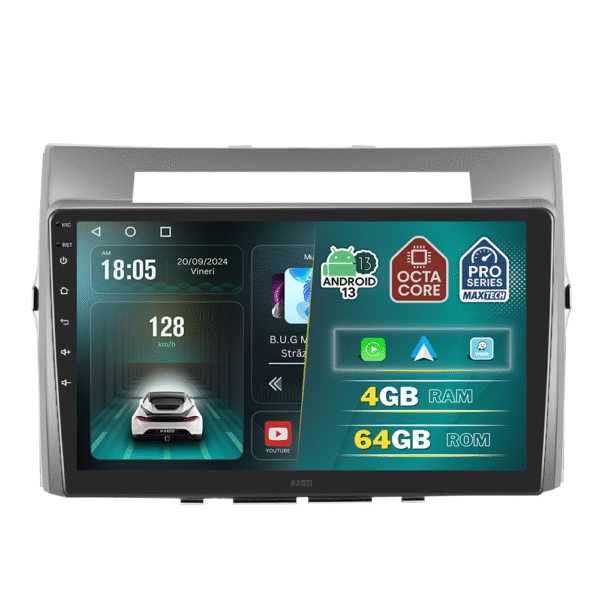 Sistemul MaxTech ProSeries este echipat cu un procesor OctaCore de tip 4+4, 4 GB RAM si 64 GB stocare, pentru multitasking rapid. Ecranul IPS HD de 1280×720 ofera culori reale si vizibilitate excelenta din orice unghi, cu design modern 2.5D.