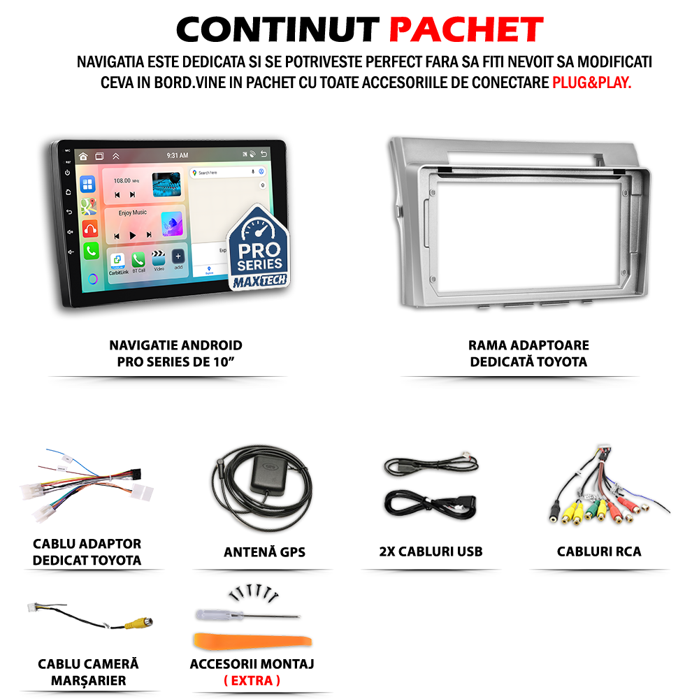 Navigatie Toyota Corolla Verso (2006-2009) dedicata, MaxTech® PRO SERIES, 4 GB Ram 64 GB Rom OctaCore, Carplay & Android auto, Ecran 9 ” HD Touch, GPS, Wifi, EQ, Bluetooth, Radio, Waze, Youtube
