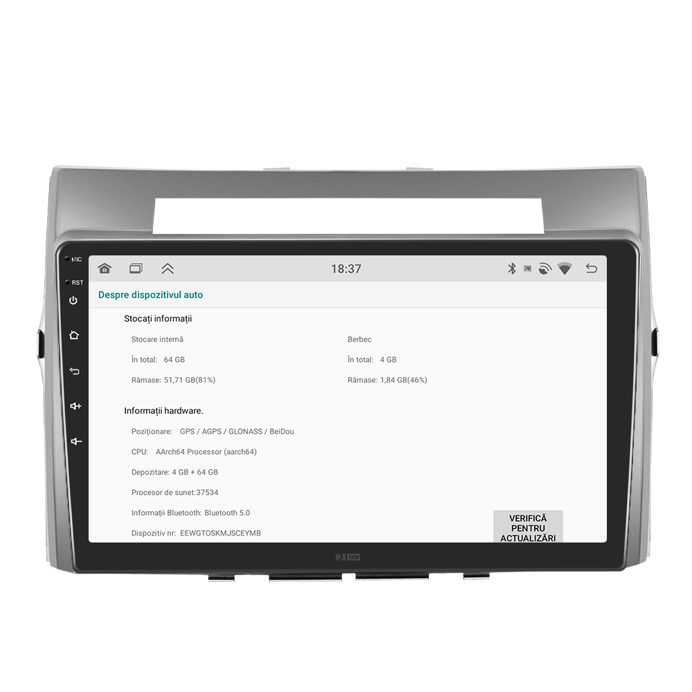 Sistemul MaxTech ProSeries este echipat cu un procesor OctaCore de tip 4+4, 4 GB RAM si 64 GB stocare, pentru multitasking rapid. Ecranul IPS HD de 1280×720 ofera culori reale si vizibilitate excelenta din orice unghi, cu design modern 2.5D.