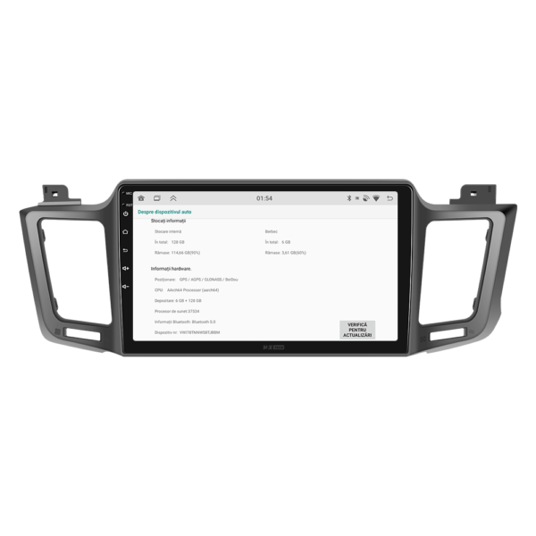 Sistemul MaxTech Pro Series este echipat cu un procesor OctaCore de tip 4+4, 6 GB RAM si 128 GB stocare, pentru multitasking rapid. Ecranul IPS HD de 1280×720 ofera culori reale si vizibilitate excelenta din orice unghi, cu design modern 2.5D.