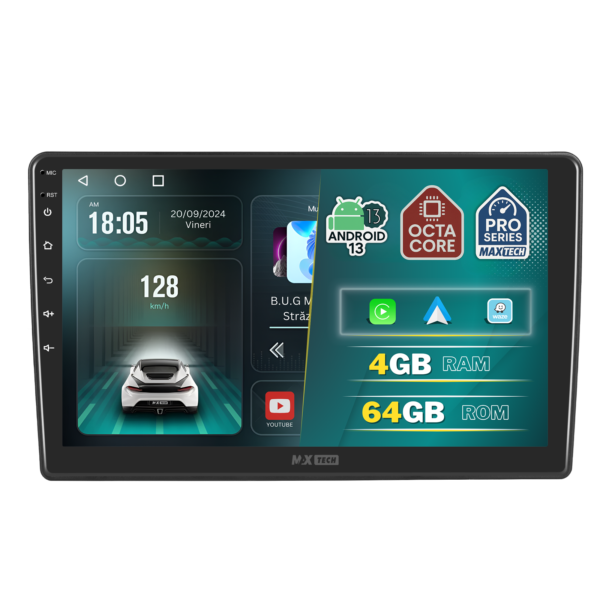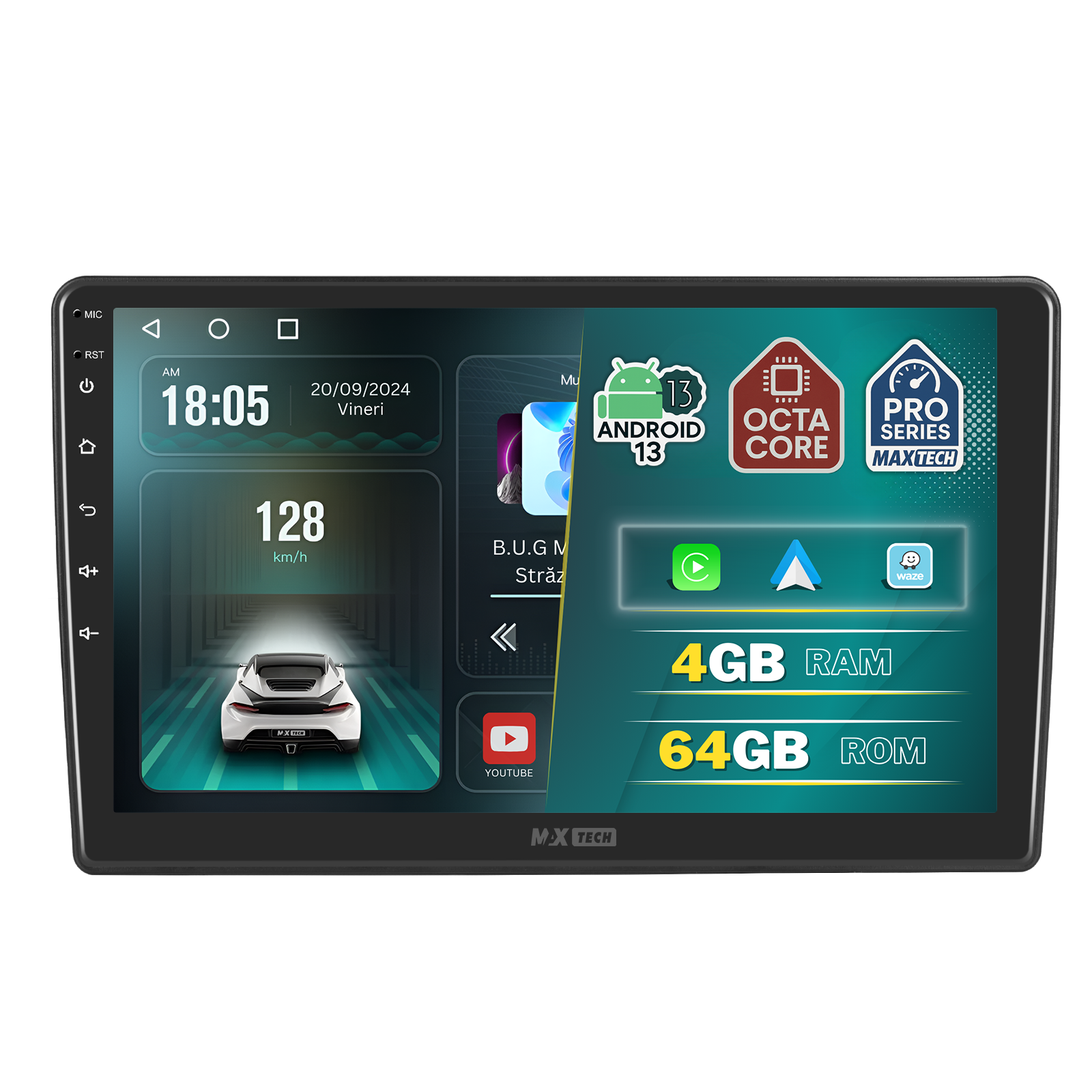 Navigatie Universala 2 DIN, MaxTech®, Android 13, ecran de 10 inch, 4GB Ram 64 ROM, Octa-Core 2.6Ghz, FullHD, functii GPS, Touchscreen, Bluetooth, Carplay, Radio, Wifi, protectie ecran, Waze