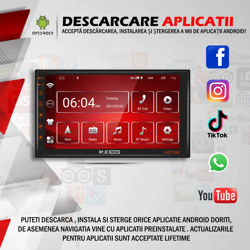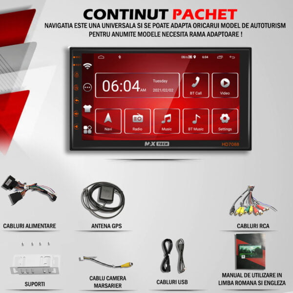 | Continut pachet | 1 x Cabluri alimentare, 1 x Cabluri RCA video si audio, 1 x Antena GPS, 1 X Manual de utilizare in limba romana si limba engleza, 1 x Cablu camera marsarier, 2 x cabluri USB, 1 x Suporti montare |