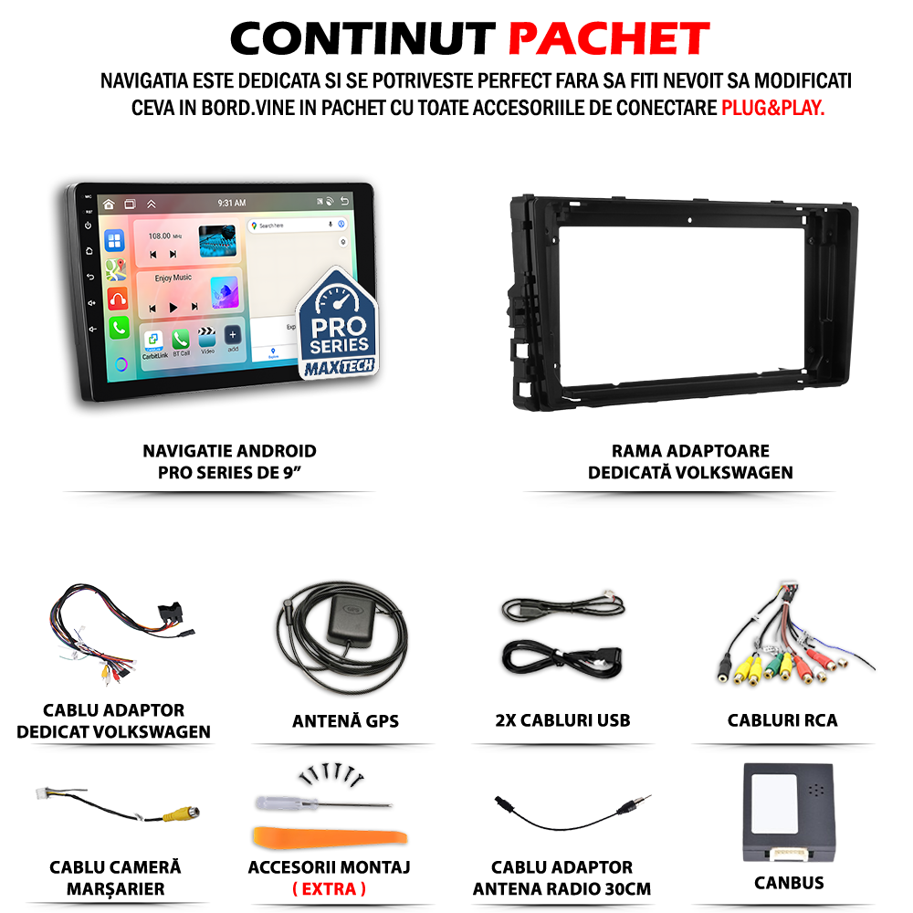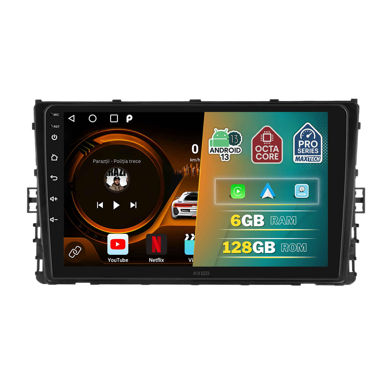 Navigatie Volkswagen Polo, T-Roc, Transporter, California (2015-2025) dedicata, MaxTech® PRO SERIES, 6 GB Ram 128 GB Rom OctaCore, Carplay & Android auto, Ecran 9” HD Touch, GPS, Wifi, Bluetooth